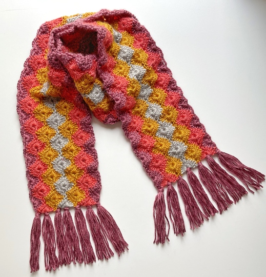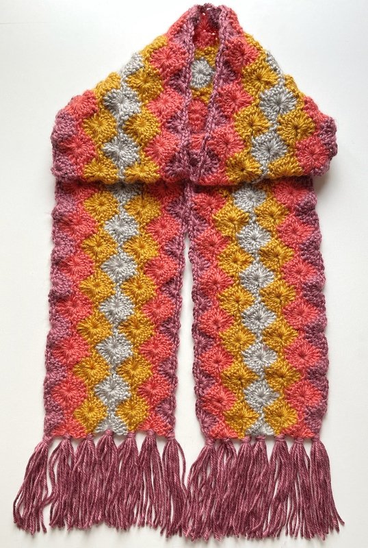 I wanted to use some of my worsted yarn up to give space for the new yarn I ordered. I was planning to create a scarf with a beautiful and textured stitch which looks great with different colors so I decided to use the starburst stitch.