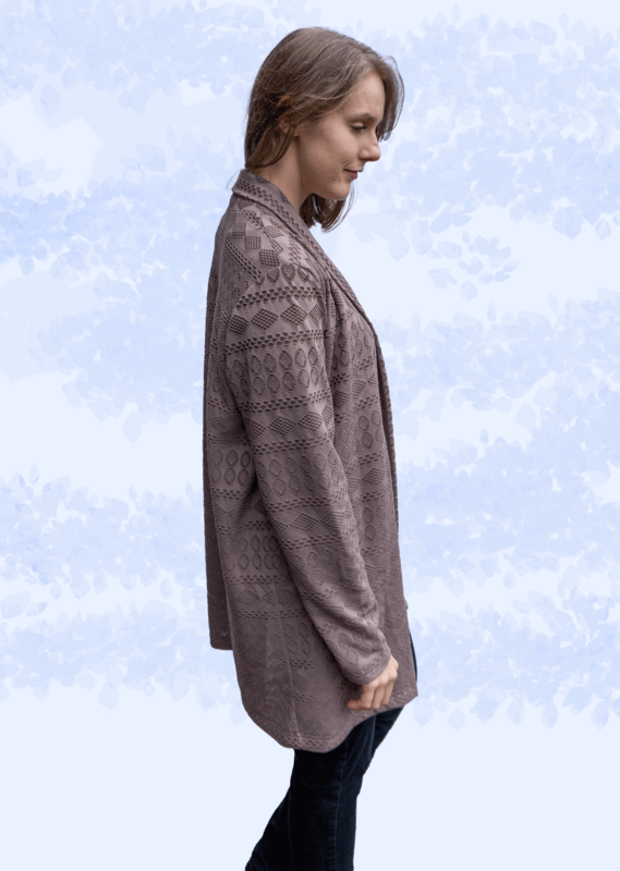The “Anna” pattern is a loose-fitting cardigan with long sleeves. Designed to be worn open, the cardigan is available in three different length options: hip-length, mid-thigh, or knee-length. The long sleeves can be hemmed with a simple fold or finished with a cuff.