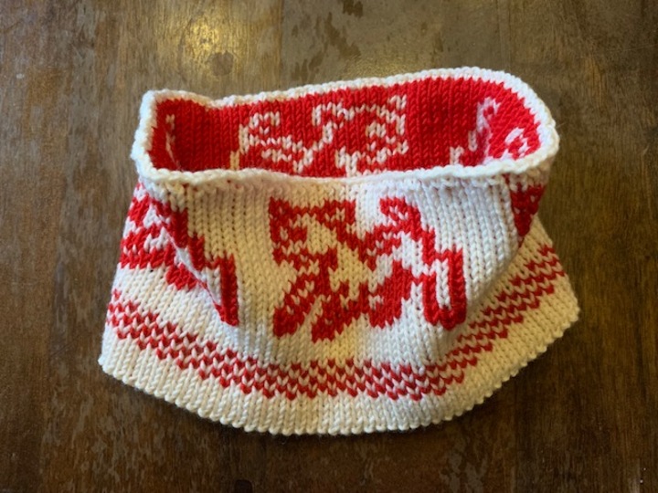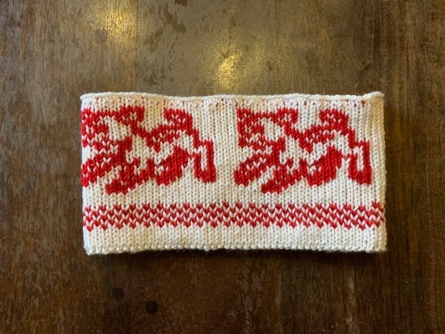 Dieses Stirnband ist in einer Technik namens double face gestrickt. Dies bedeutet, man hat innen keine Fäden gespannt, an denen man beim Anziehen auch noch hängenbleibt (und zu allem Übel vielleicht auch noch Fäden zieht!). Vielmehr kann man sie einfach wenden und hat dann keine roten Rehe mehr auf weißem Grund, sondern weiße Rehe auf rotem Grund.
