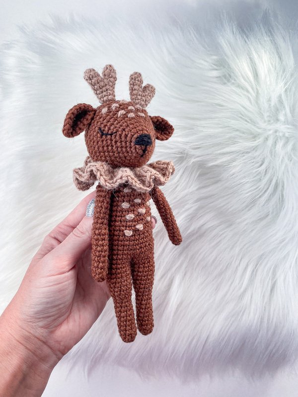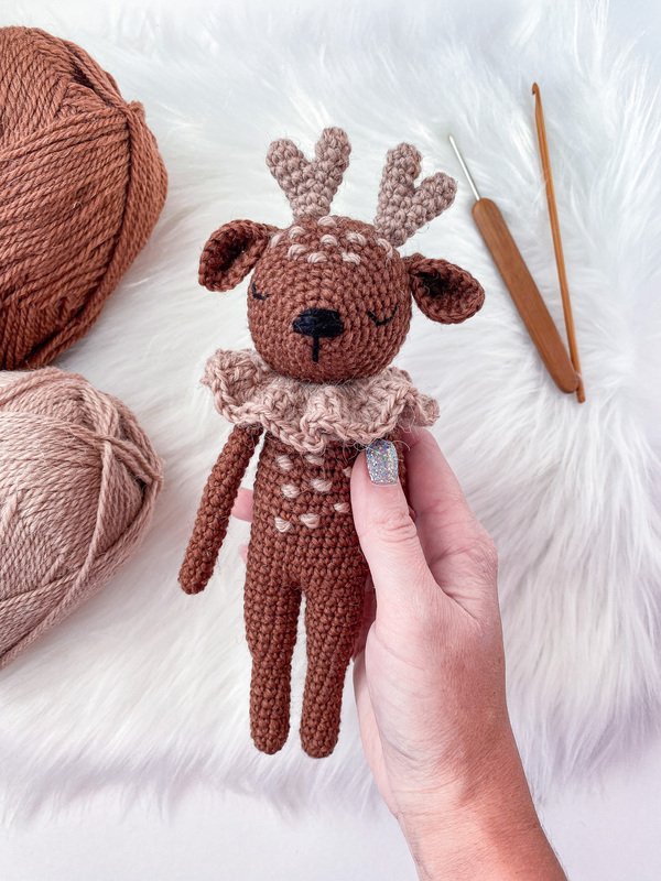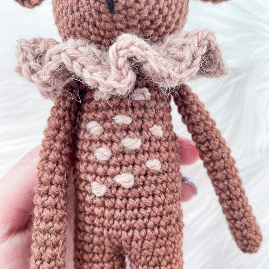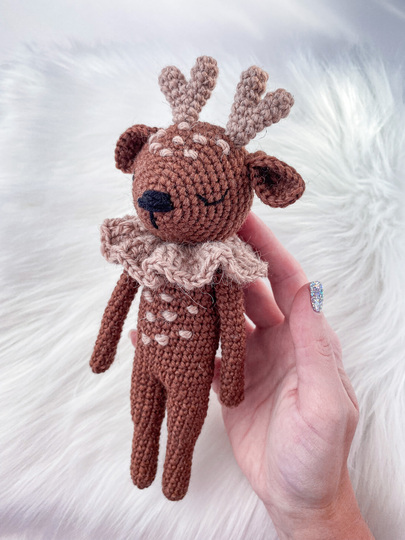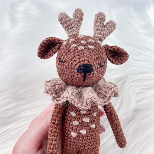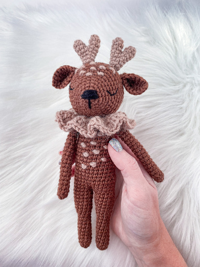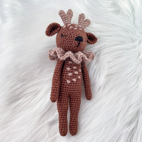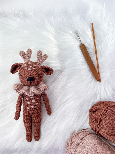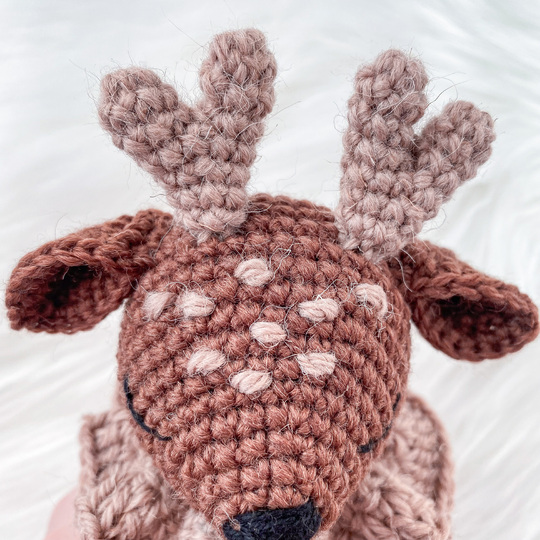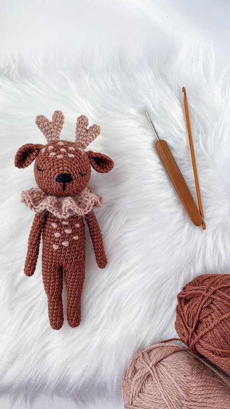 Deer is about 21 cm (8 inches), If you use yarn 250m/100g (273 yards/3,5oz). The final size of the toy depends on the thickness of the yarn, the hook size and the density of crocheting, so it may slightly differ from what I noted in the pattern.