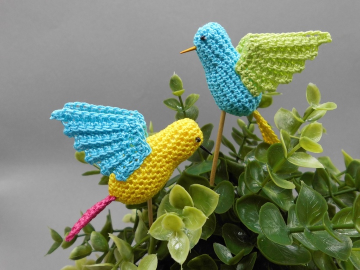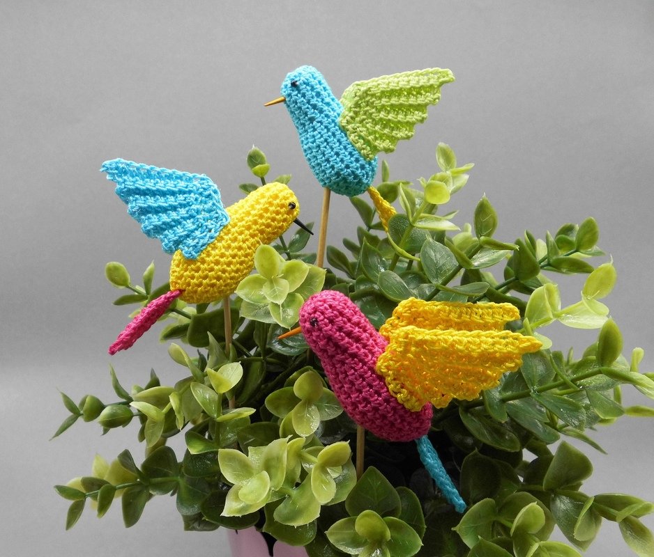 The little birds bring cheerful color and good mood in your home and can be used in many ways for decoration, for example, as a decorative hanger on branches in a vase or as flower stick for potted plants.