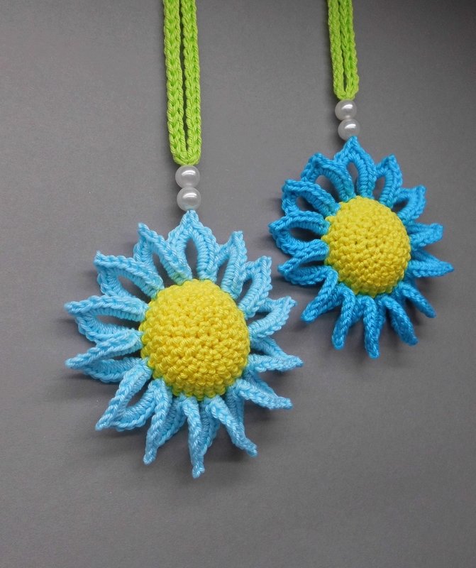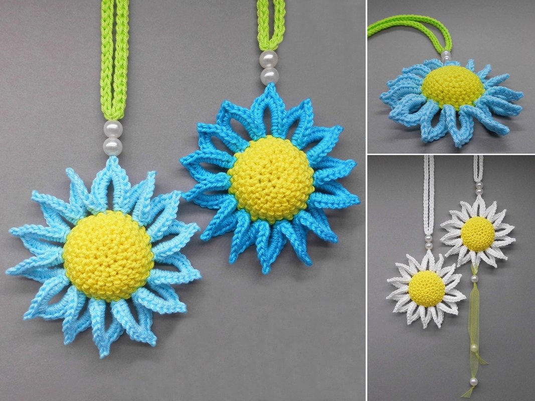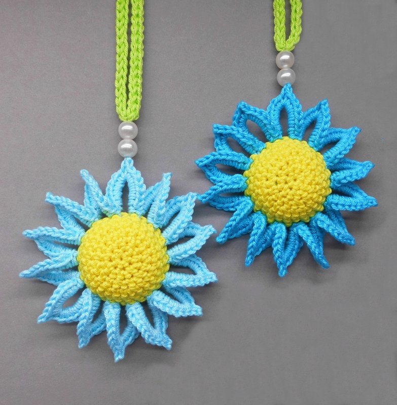 The large, three-dimensional flower is very easy to crochet from scraps of yarn in your favorite colors and looks great as a decorative hanger on doors, windows, walls or doorknobs.