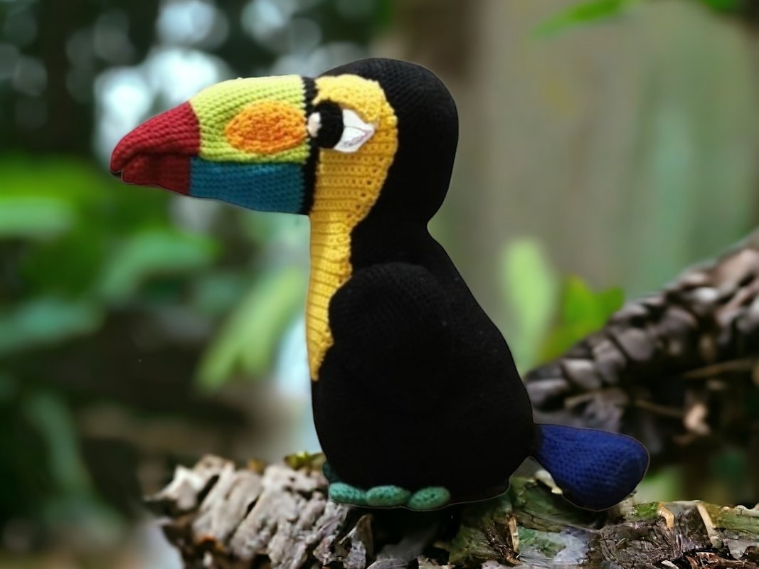 The finished toucan will be about 23cm. Of course, the size can vary depending on whether you crochet tight or loose. The choice of wool is also important. I crochet with Apollo cotton yarn 125m/50g (100% cotton).