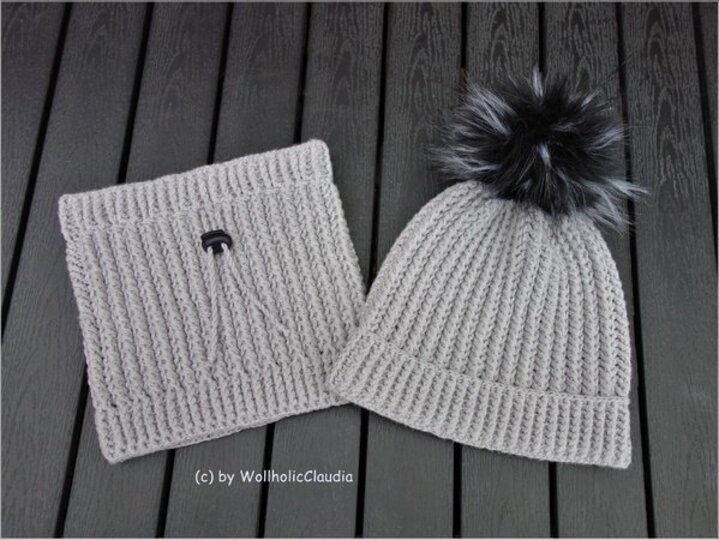 Dieses Set besteht aus einem Schalkragen und der passenden Mütze. Der Schalkragen sowie auch die Mütze sind absolut unisex und natürlich individuell in der Länge bzw. der Größe und mit jedem beliebigen Garn machbar.