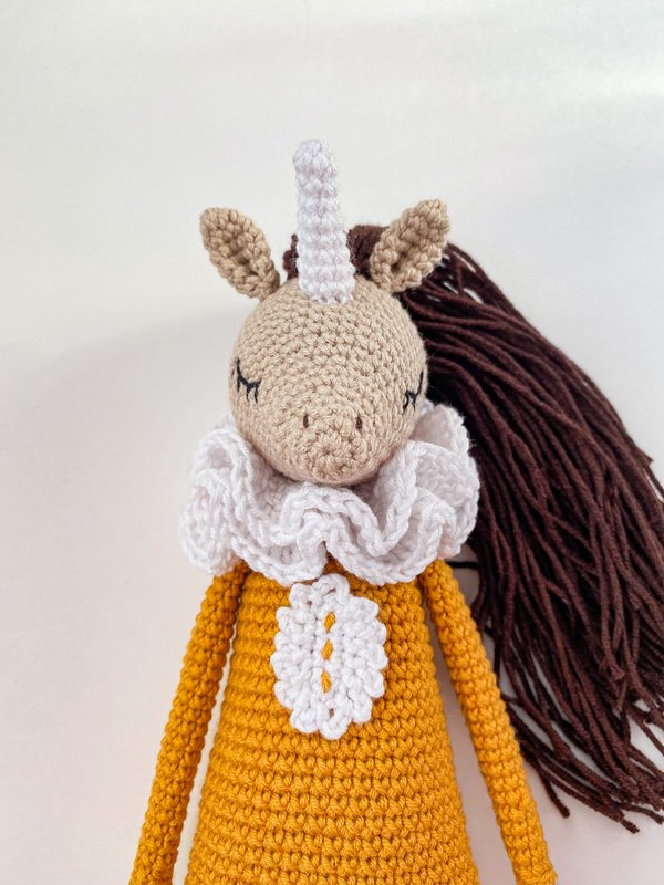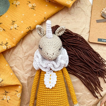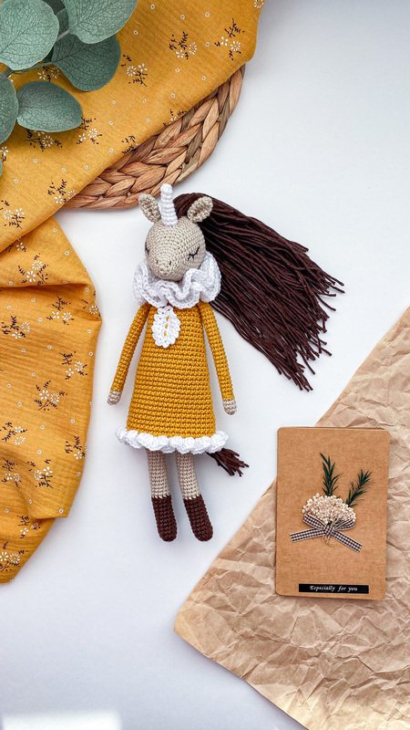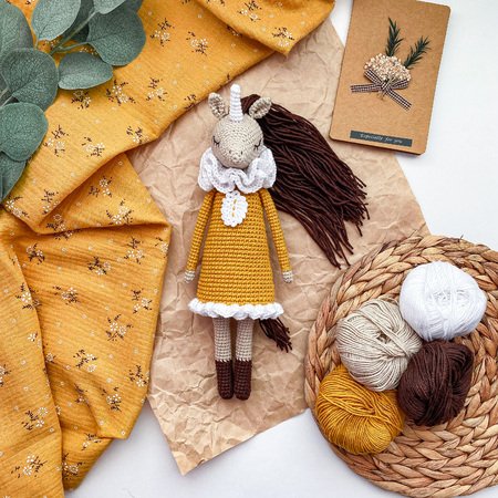 Unicorn is about 30 cm (12 inches), If you use cotton yarn (100g/270m) and hook №2. The final size of the toy depends on the yarn thickness, the hook size and the density of crocheting, so it may slightly differ from what I indicated in the pattern.
