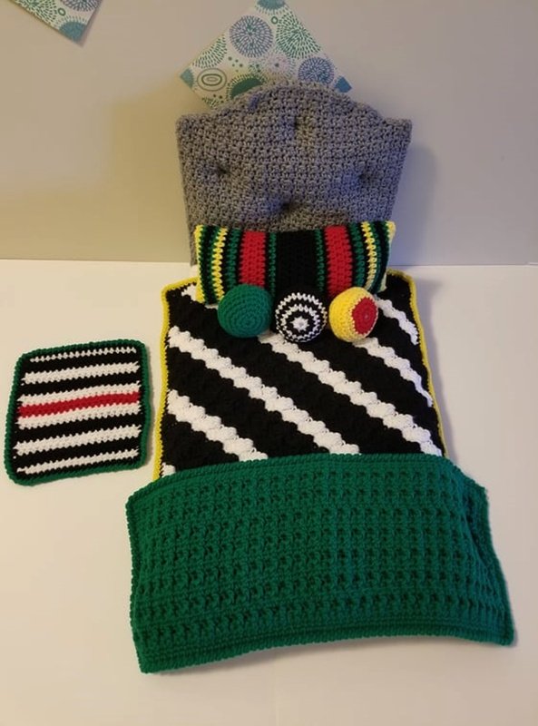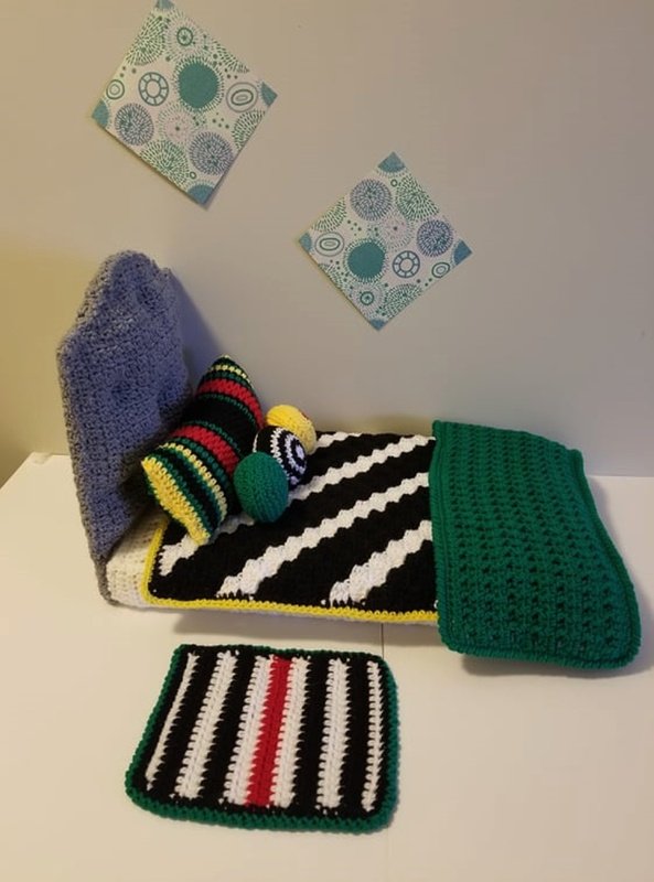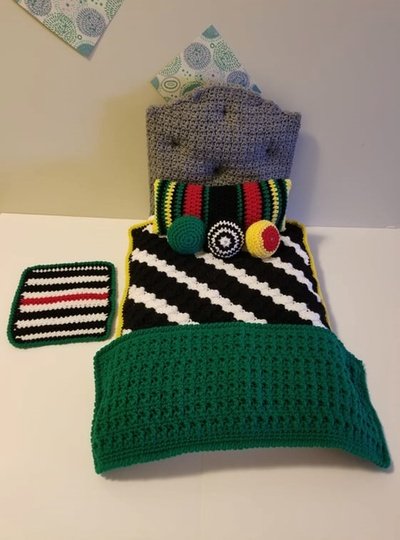 A fun fall crochet bedding set for the 18* doll. A blanket to cover your doll up, a throw for across the bottom, 3 pillows for her comfort and a sweet little matt for him to keep his toes warm when she gets up. A great little set to make for a boy doll as well for a girl doll.
