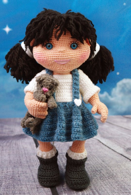 According to this crochet pattern you can crochet the doll Masha and her kitty Murka, depending on the yarn, you have chosen. The head, arms and legs are fastened to the body with the cotter pins, it allows to turn the parts of the body in different directions. If you have no cotter pins, you can make a thread fastening of the arms and legs to your doll.