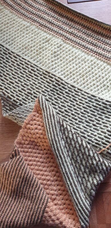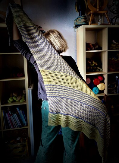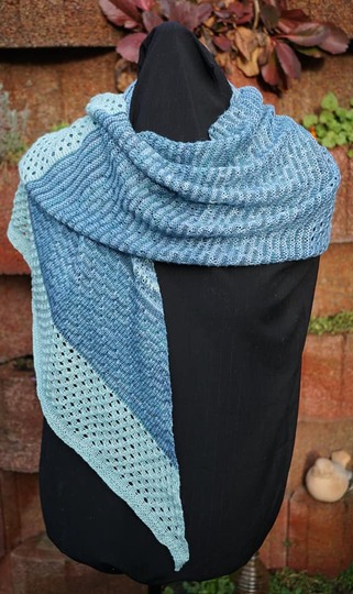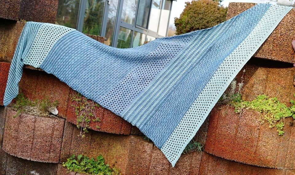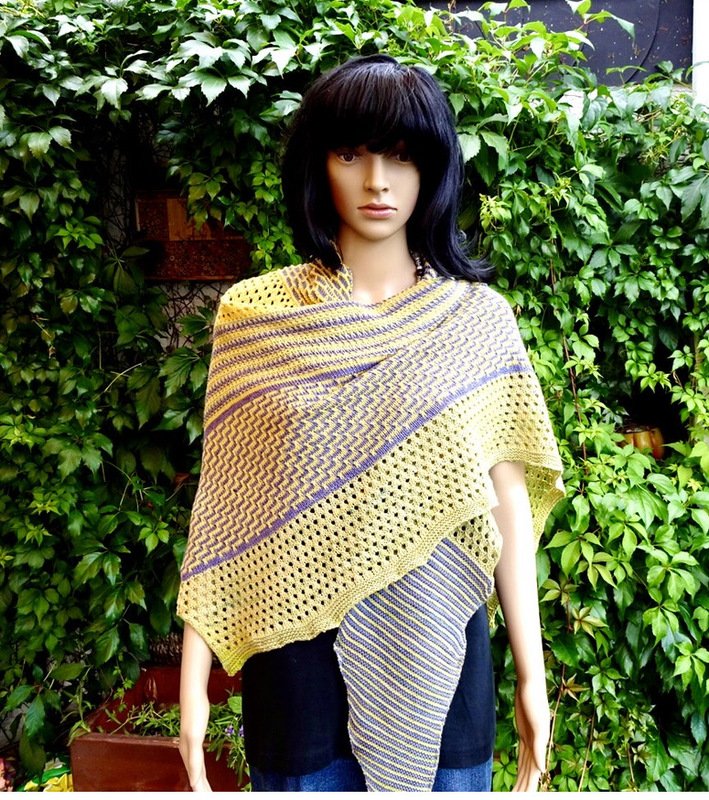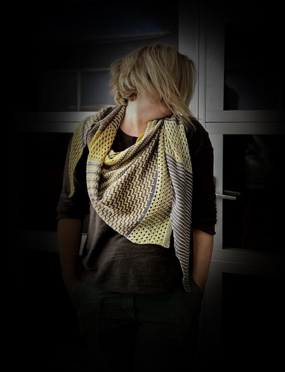 Tashi ist ein Dreieckstuch mit verschiedenen einfachen Mustern aus Hebemaschen und einem einfachen Lochmuster.