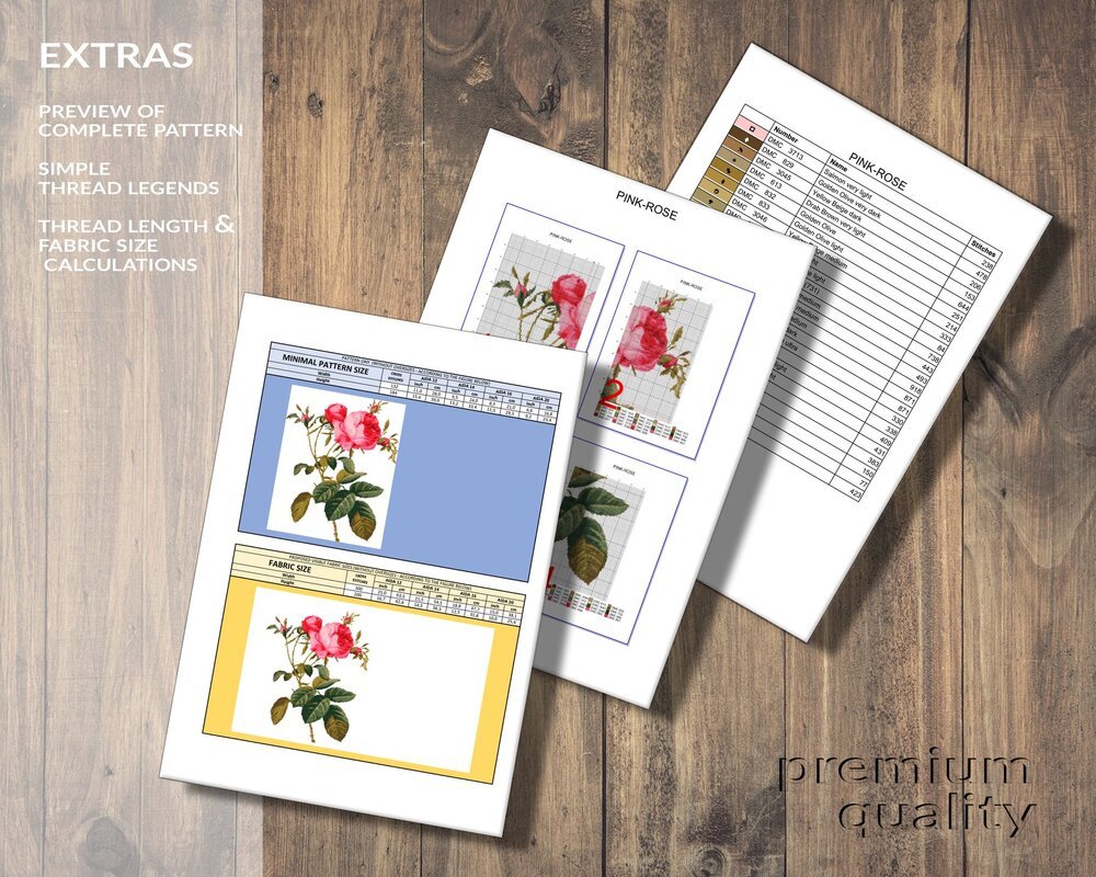 You get ready-made cross stitch patterns and calculations of thread lengths and fabric sizes for 12ct, 14ct, 16ct and 20ct: