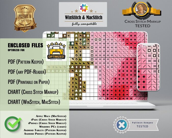 You will receive the cross stitch pattern as PDF files, available for instant download. The digital files are optimized for printing an paper or fore use on the screens of tablets, mobile phones or laptops (well tested for Pattern Keeper, WinStitch, etc.). You can buy these files right here and download them immediately.
