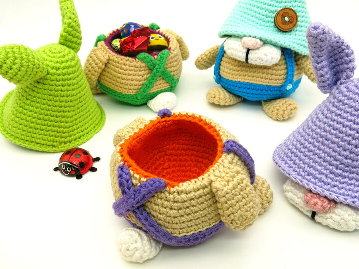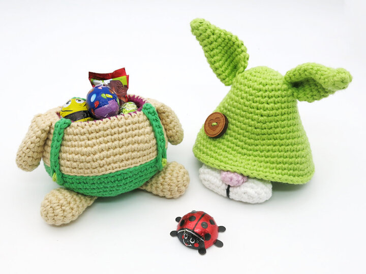 With 3.0 mm hook and DK yarn or 2 strands of sport weight yarn the Easter Bunny Gnomes get to be 12 x 8 cm tall (without ears & arms).