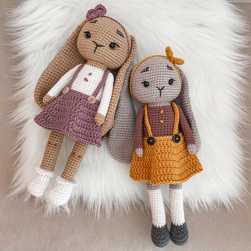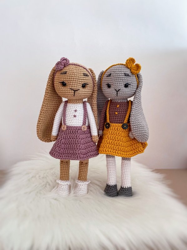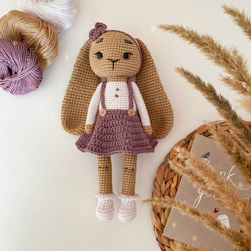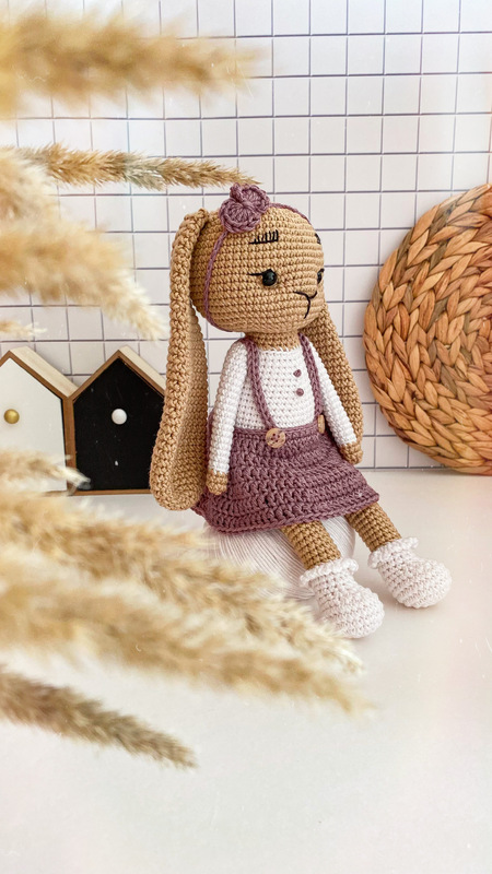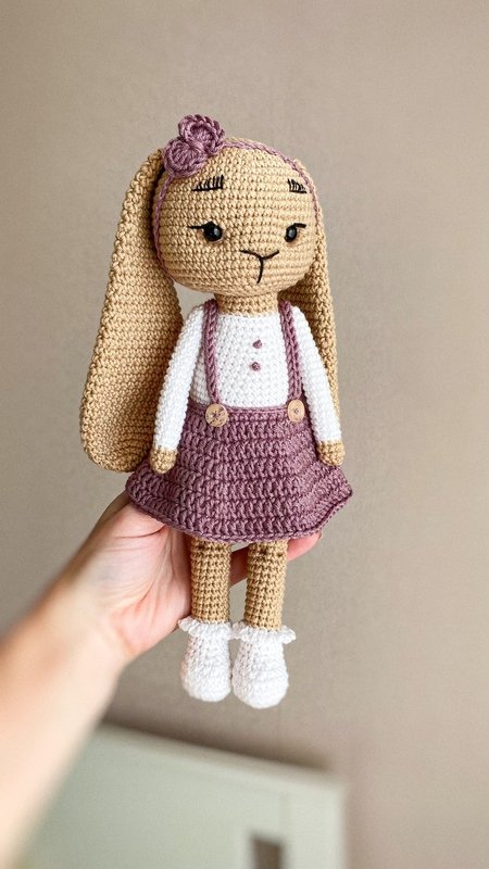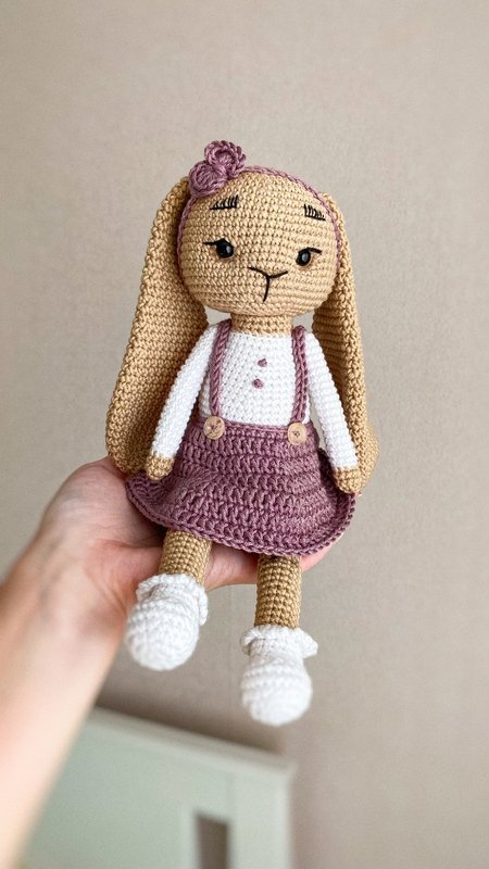 Bunny is about 10 inches, If you use cotton yarn (165m/50g) and hook №2. The size of the toy depends on the yarn thickness, the hook size and the density of crocheting, so it may slightly differ from what I noted in the pattern.