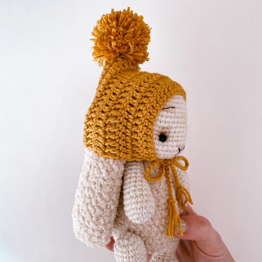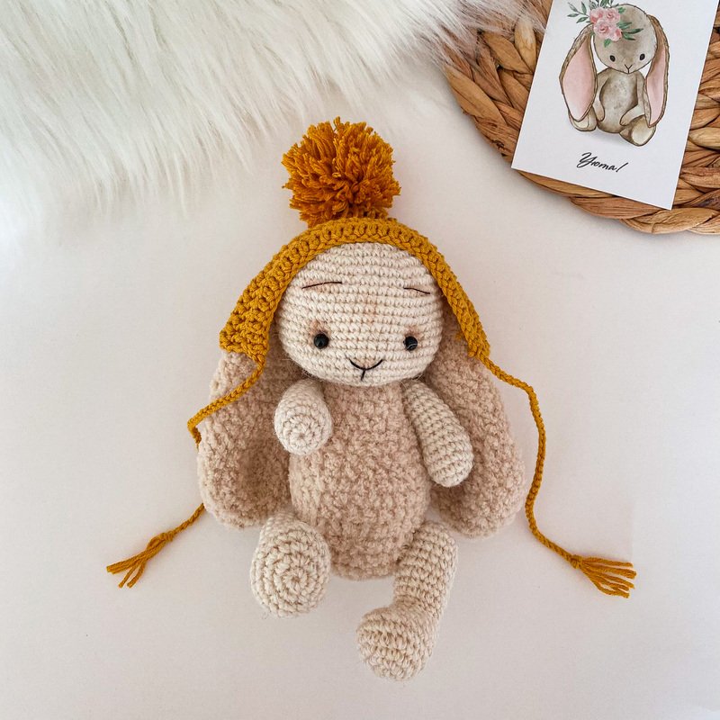 Bunny is about 8 inches (20 cm). The size of the toy depends on the yarn thickness, the hook size and the density of crocheting, so it may slightly differ from what I indicated in the pattern.