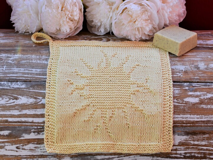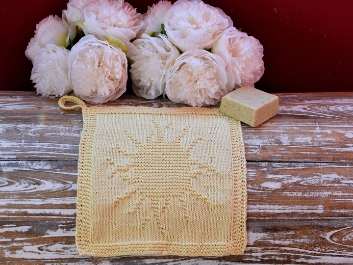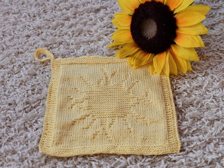 With this lovely cloth you can bring sunshine into your bathroom or kitchen – it can be used either as washcloth or as dishcloth. The sun’s warmth is so precious for our well-being, and it brings light into our life. That’s why I think this cloth is a great present for all loved ones who need a little cheer up. And of course you can also knit it for yourself and enjoy the sunshine every day 😊 The cloth is very easy to work with only knits and purls.