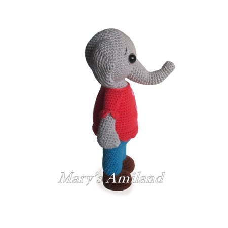 It is crocheted in one piece starting from the feet up to the head. only ears and trunk are sewed on separately. I used a pipe cleaner to make the trunk pose-able.