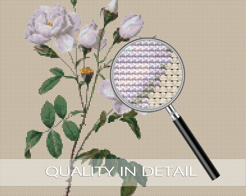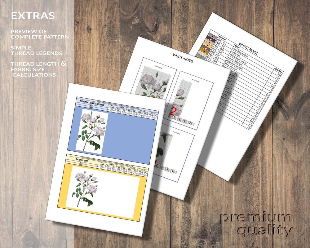 You get ready-made cross stitch patterns and calculations of thread lengths and fabric sizes for 12ct, 14ct, 16ct and 20ct: