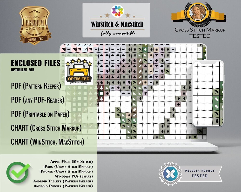 You will receive the cross stitch pattern as PDF files, available for instant download. The digital files are optimized for printing an paper or fore use on the screens of tablets, mobile phones or laptops (well tested for Pattern Keeper, WinStitch, etc.). You can buy these files right here and download them immediately.