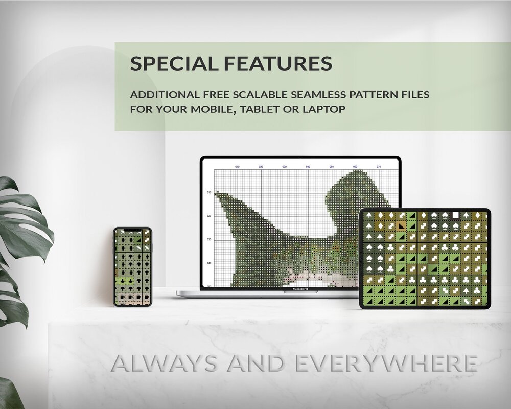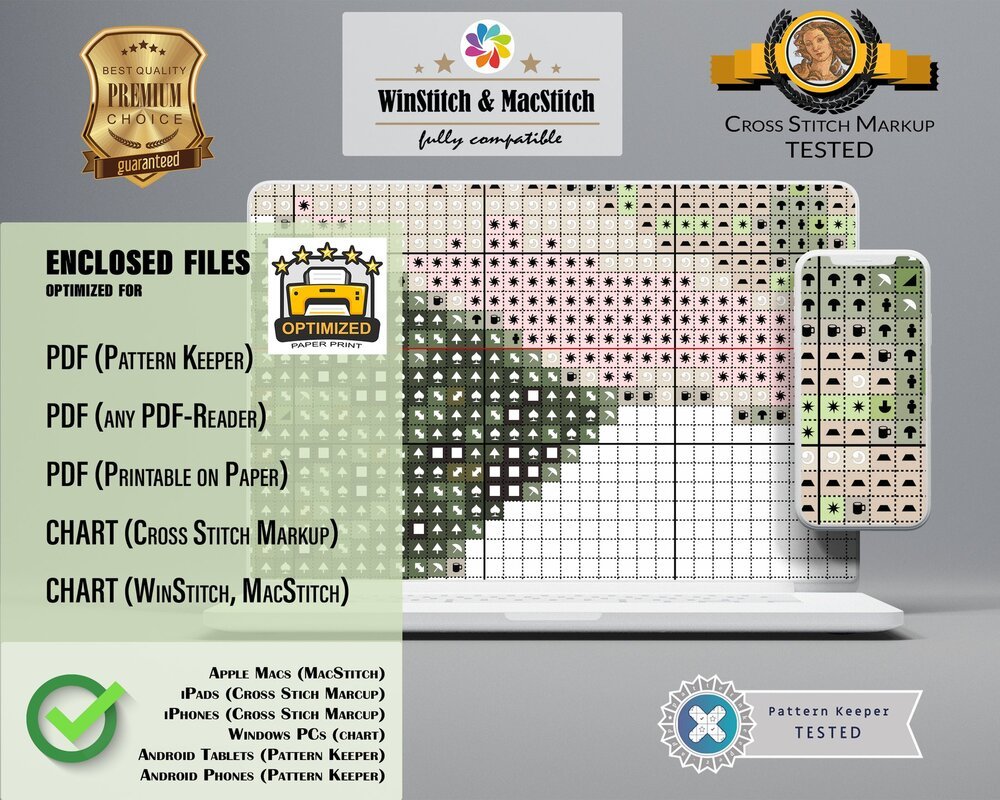 You will receive the cross stitch pattern as PDF files, available for instant download. The digital files are optimized for printing an paper or fore use on the screens of tablets, mobile phones or laptops (well tested for Pattern Keeper, WinStitch, etc.). You can buy these files right here and download them immediately.