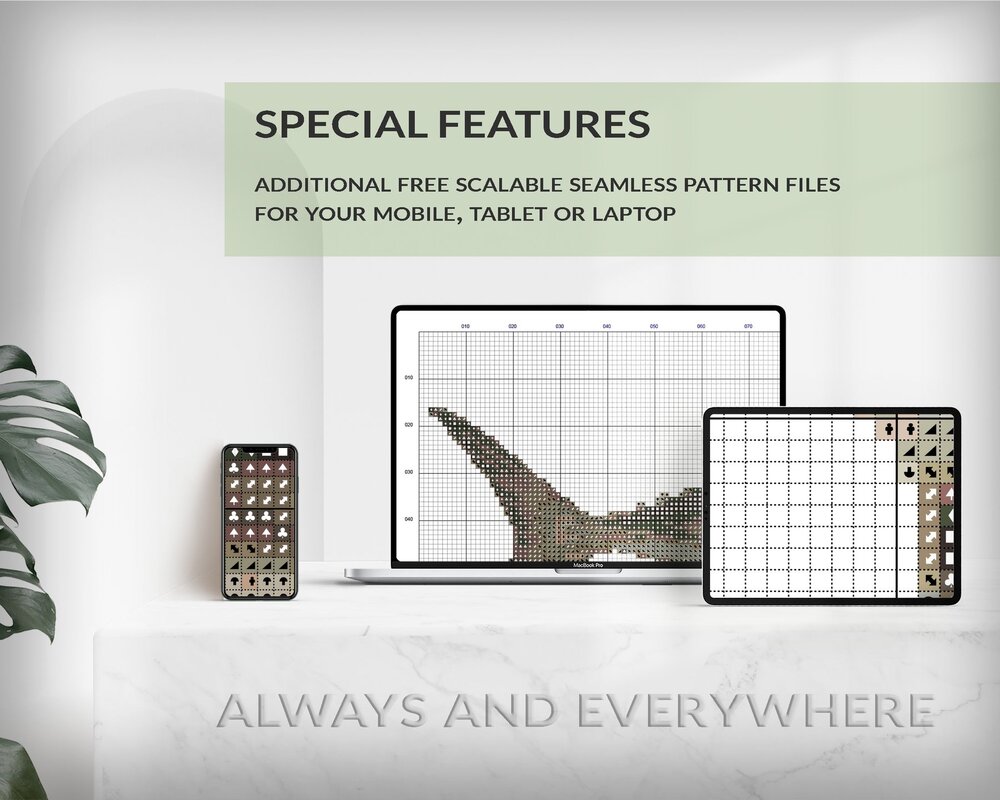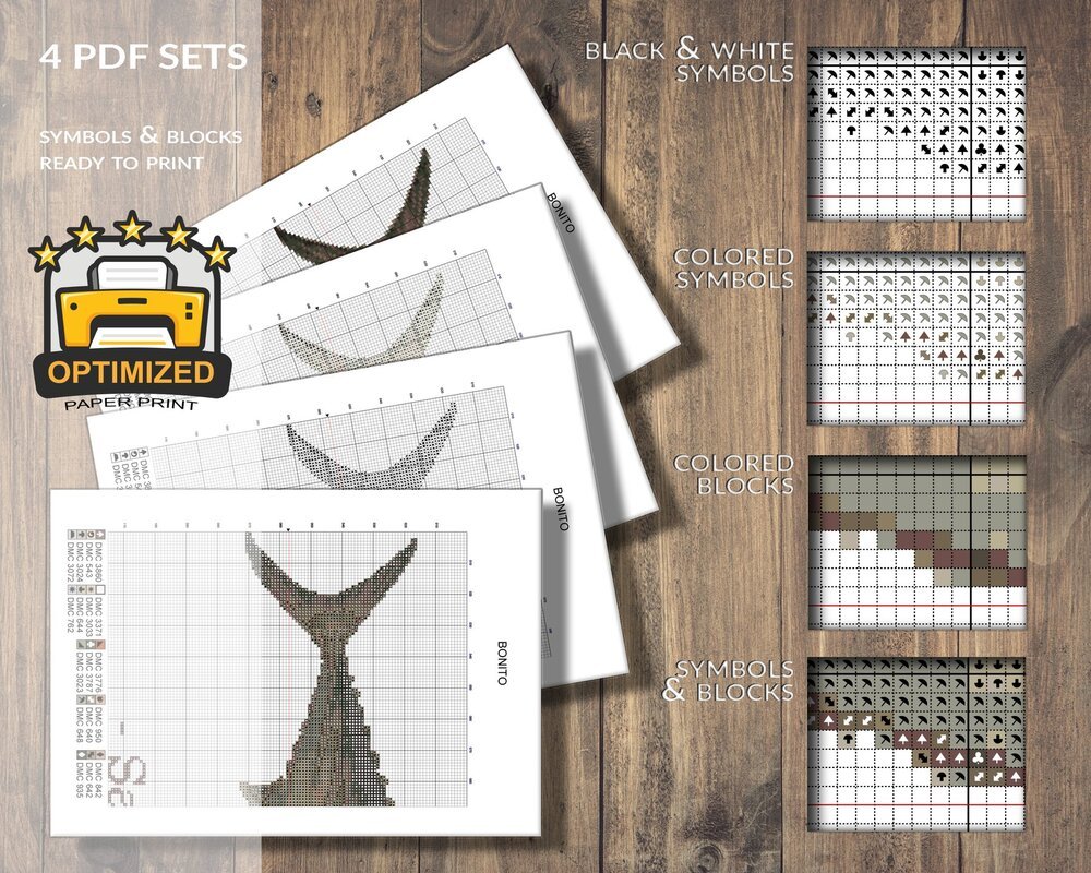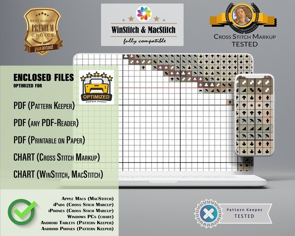 You will receive the cross stitch pattern as PDF files, available for instant download. The digital files are optimized for printing an paper or fore use on the screens of tablets, mobile phones or laptops (well tested for Pattern Keeper, WinStitch, etc.). You can buy these files right here and download them immediately.
