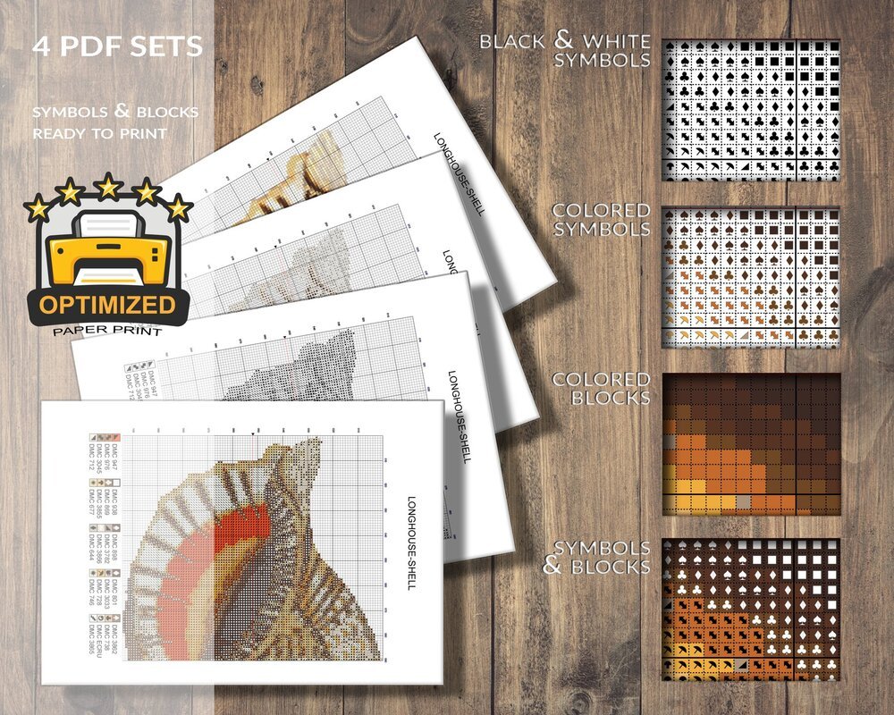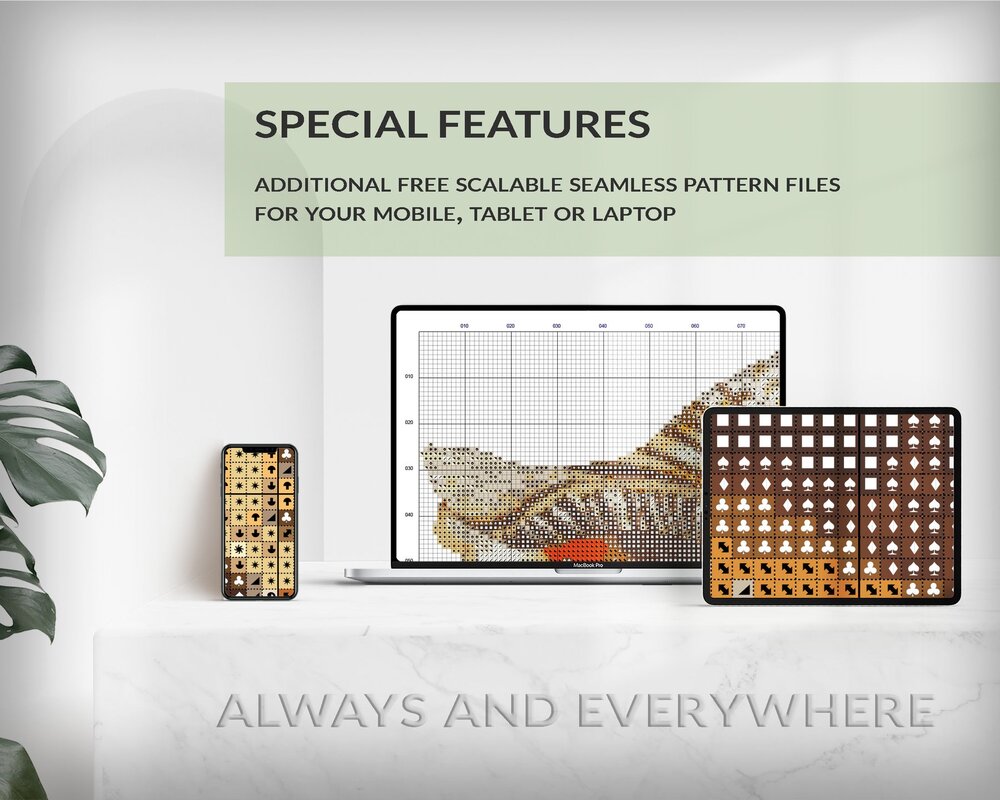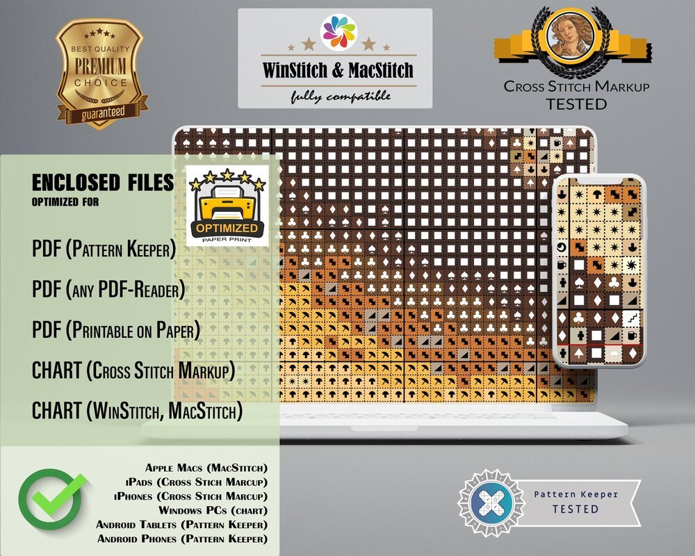 You will receive the cross stitch pattern as PDF files, available for instant download. The digital files are optimized for printing an paper or fore use on the screens of tablets, mobile phones or laptops (well tested for Pattern Keeper, WinStitch, etc.). You can buy these files right here and download them immediately.