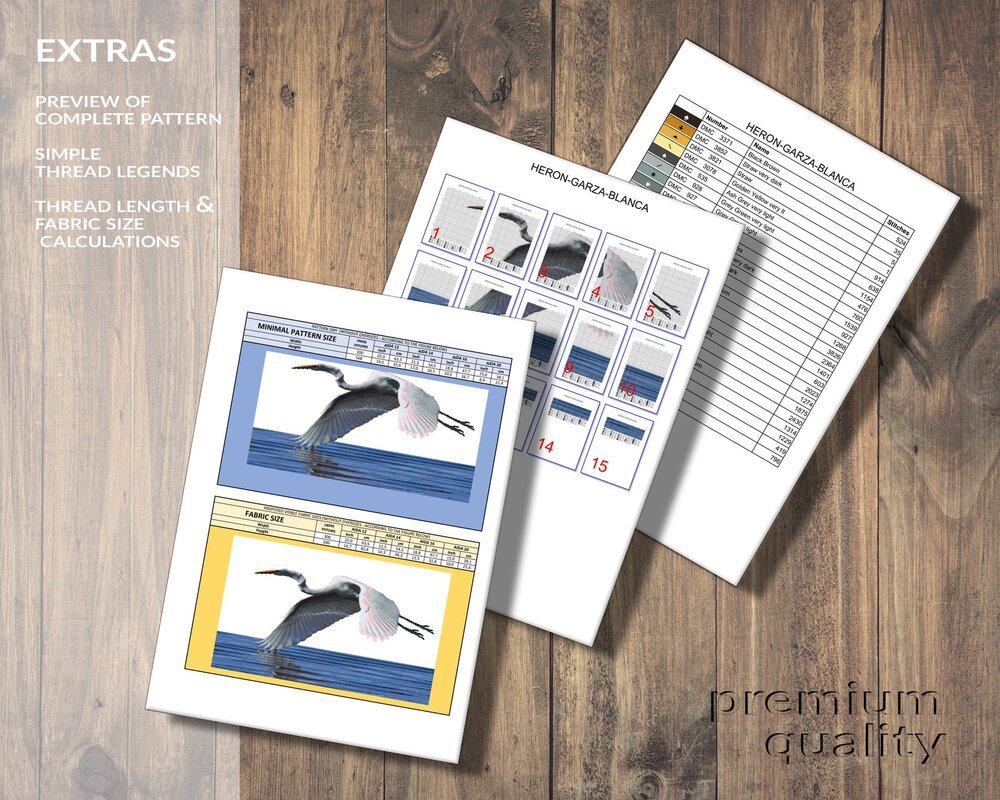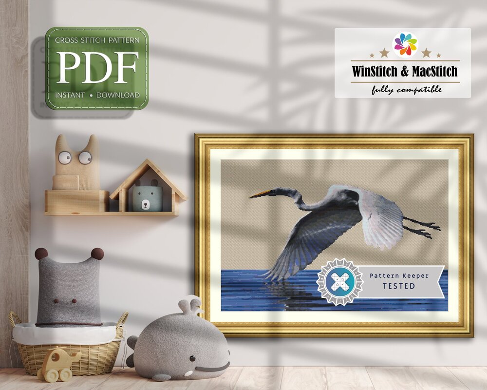 This cross stitch pattern captivates with the tension between water and air, between speed and calm. The wingtips of the flying artist cut the smooth surface of the water.