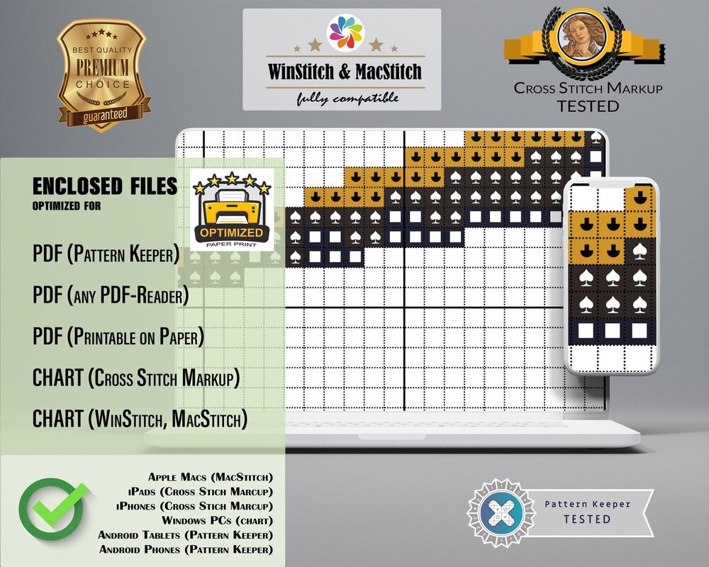 You will receive the cross stitch pattern as PDF files, available for instant download. The digital files are optimized for printing an paper or fore use on the screens of tablets, mobile phones or laptops (well tested for Pattern Keeper, WinStitch, etc.). You can buy these files right here and download them immediately.