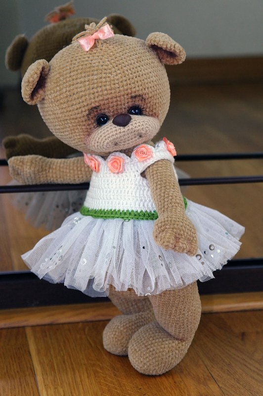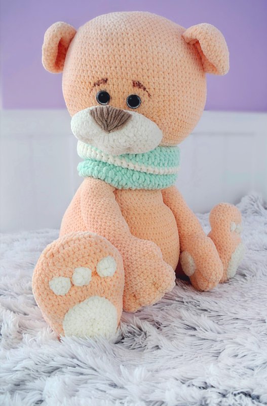 You can crochet a big plush bear or a sweet little using this crochet pattern, it all depends on the yarn you choose. The big bear was crocheted with a thick plush yarn on the wrong side, its size is 50cm while sitting, 65 cm while standing.