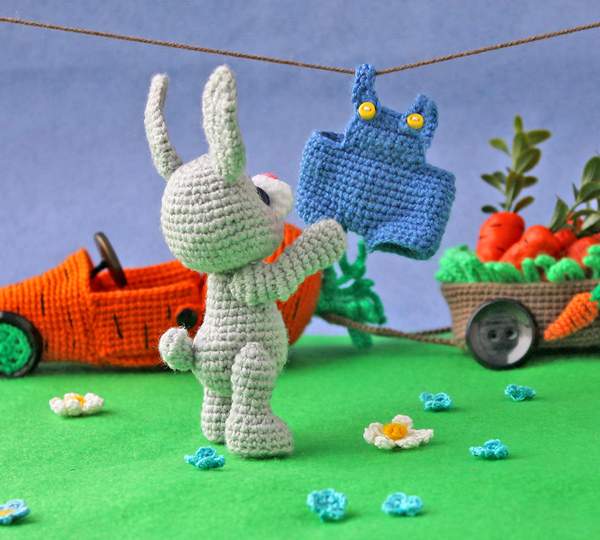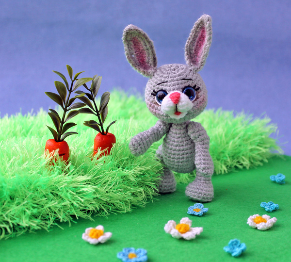 For the bunny I used 100% acrylic yarn, 300 m/100 g, 1,5 mm crochet hook, my bunny is 13cm long with the ears included.