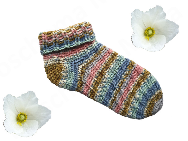 Du kannst selbst entscheiden, ob deine Socken einen breiten Bund erhalten sollen, so wie bei mir, oder ob du einen anderen Abschluss z. B. mit einer hübschen Borte häkeln möchtest.