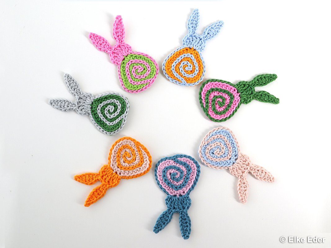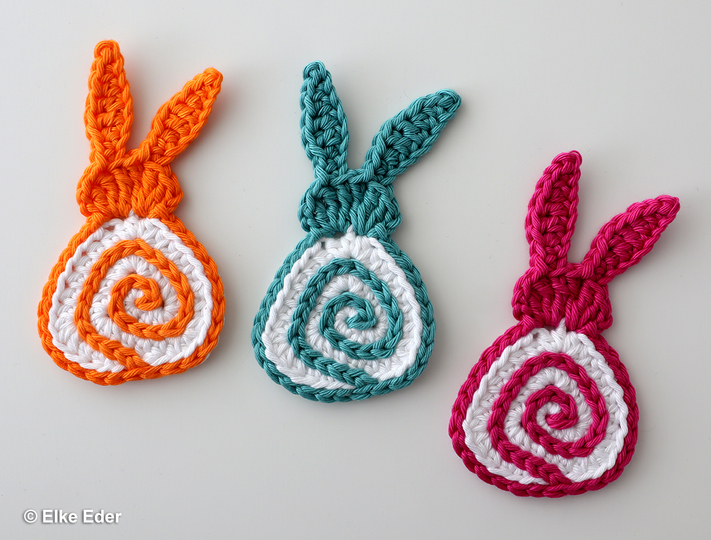 First, the body is crocheted in just 3 rounds. Then the spiral is crocheted on with a 2nd color, and the head and ears are crocheted on at the same time. This is super quick and you only need a few scraps of wool.