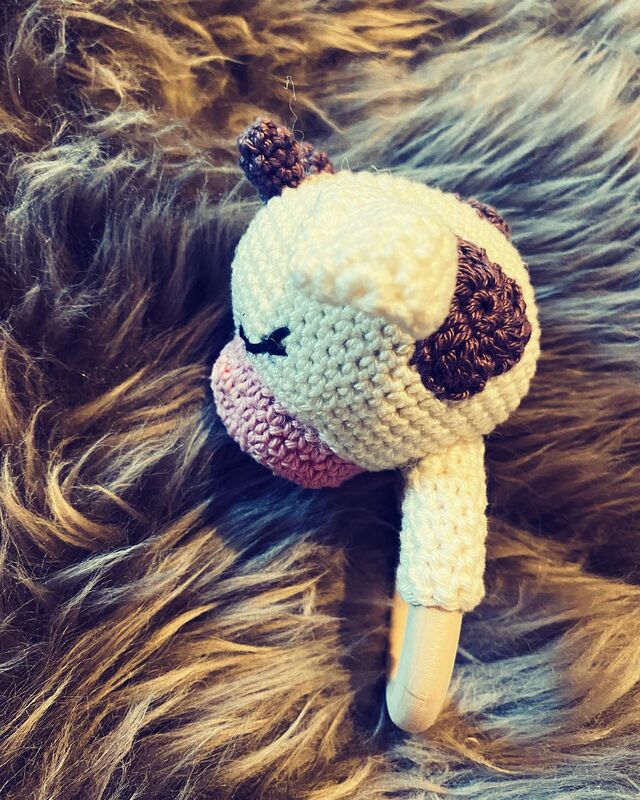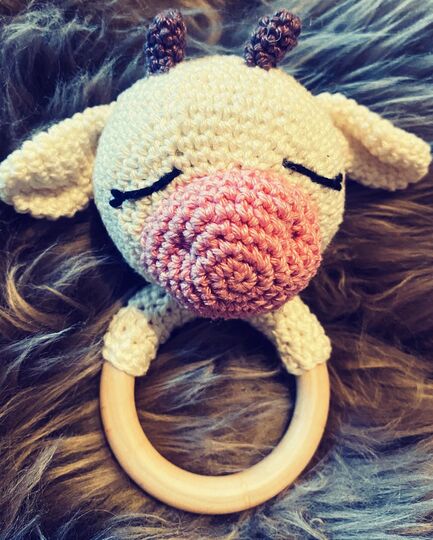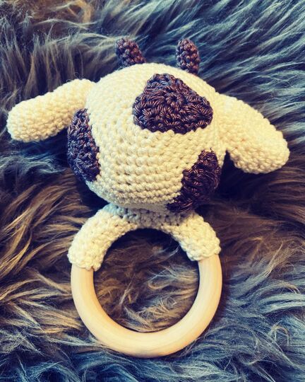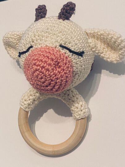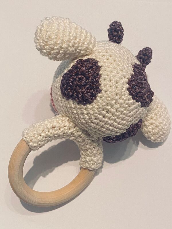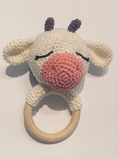 A wooden grab ring/rattle as a baby toy with a funny cow on it. Step by step instructions with many pictures