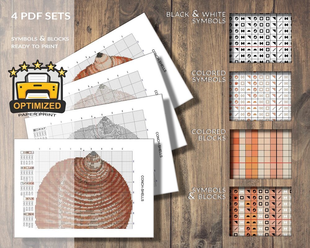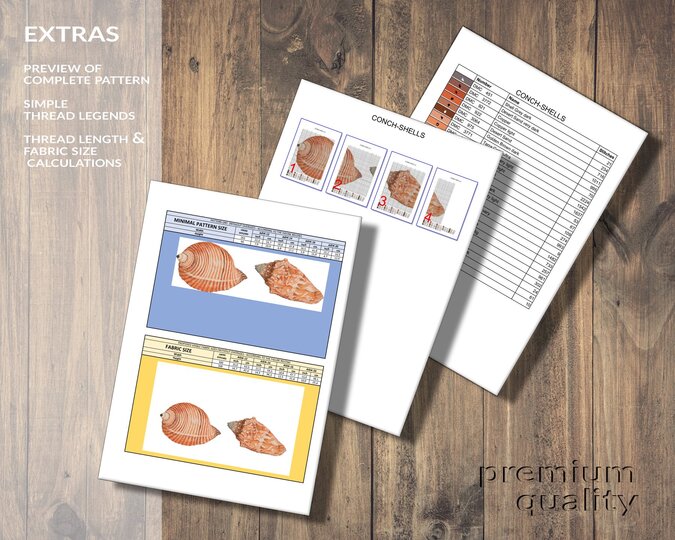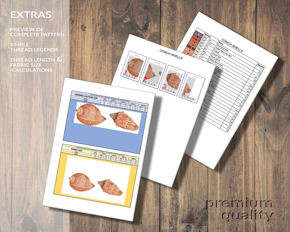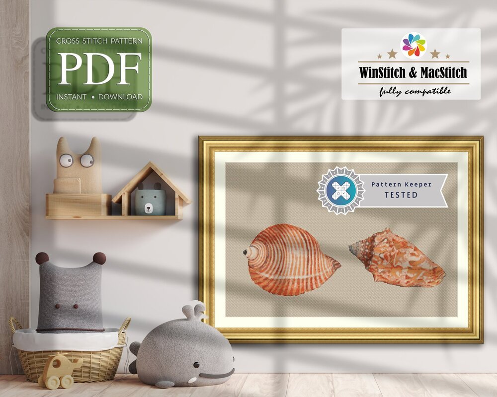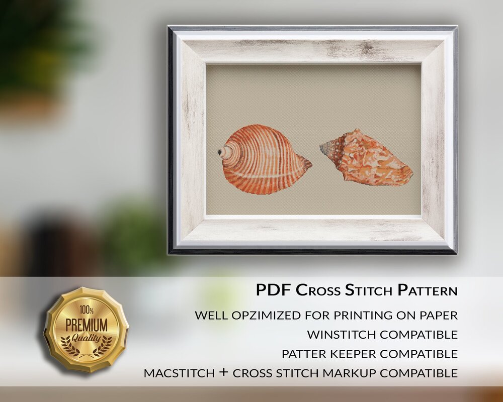 A cross stitch pattern with great detail and love for realistic shading and coloring: these shells evoke distance, sea, vacation and adventure.