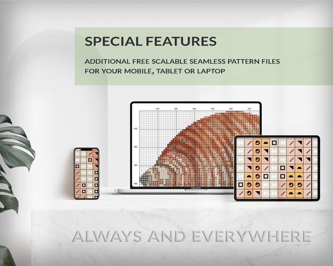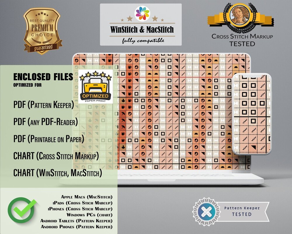 You will receive the cross stitch pattern as PDF files, available for instant download. The digital files are optimized for printing an paper or fore use on the screens of tablets, mobile phones or laptops (well tested for Pattern Keeper, WinStitch, etc.). You can buy these files right here and download them immediately.