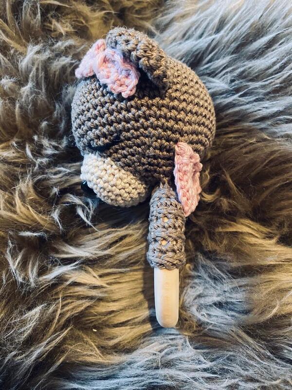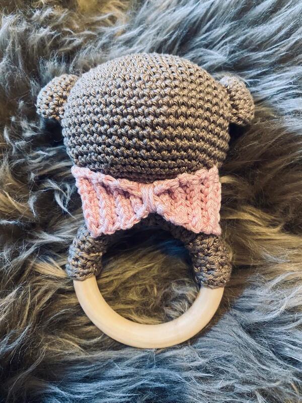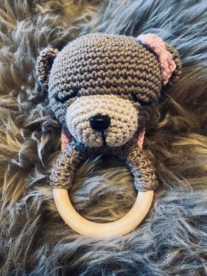 Wooden grab ring for a baby, also as a rattle with a cute bear on it.