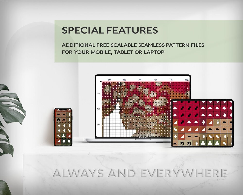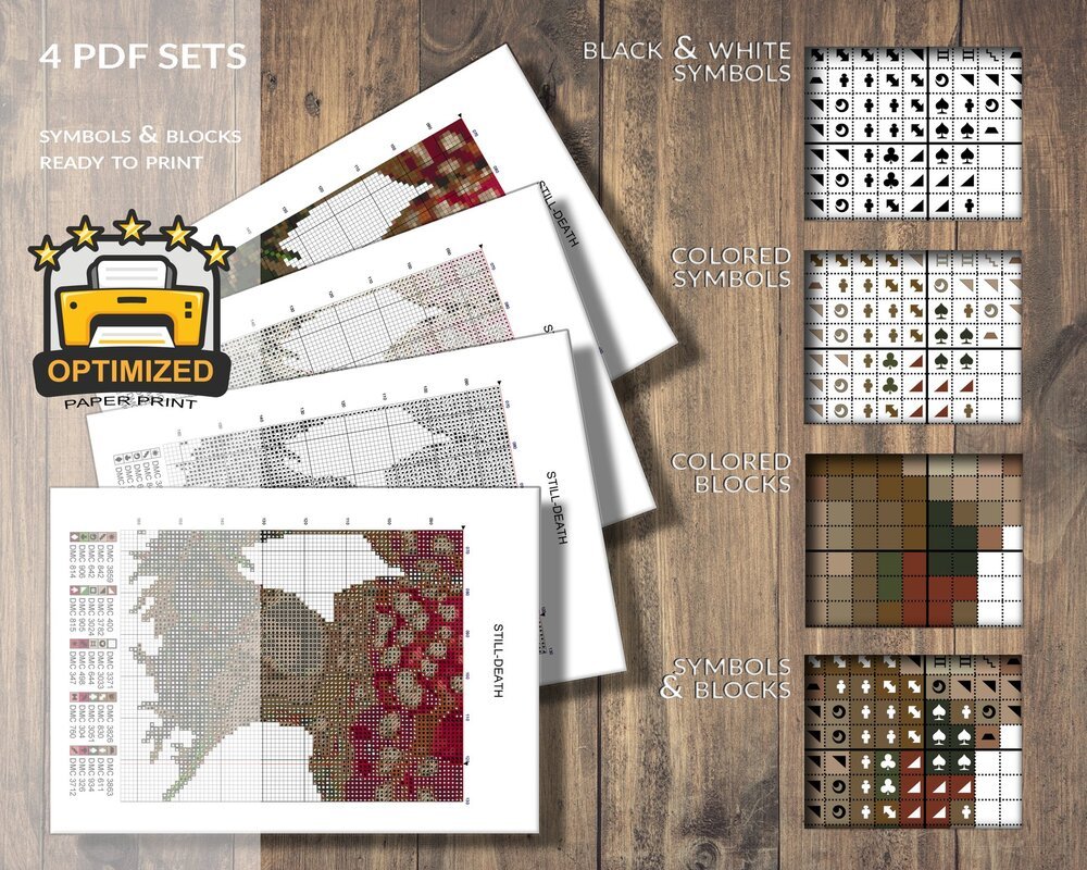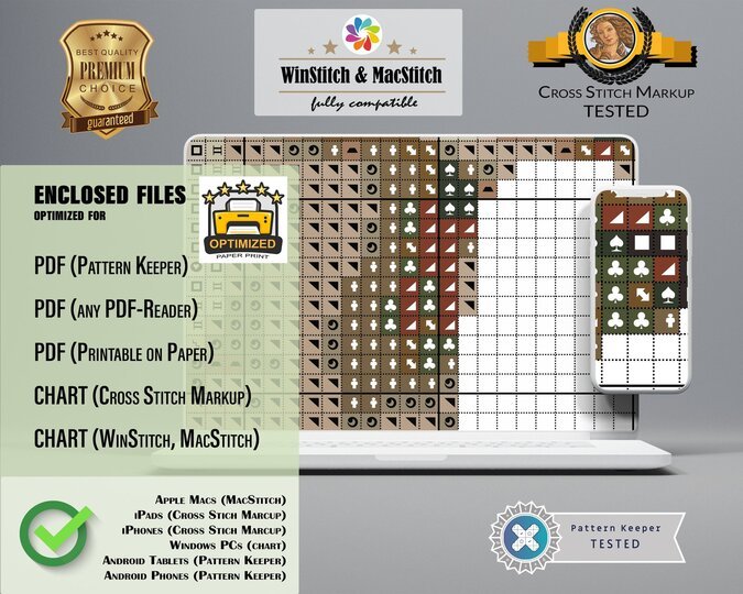 You will receive the cross stitch pattern as PDF files, available for instant download. The digital files are optimized for printing an paper or fore use on the screens of tablets, mobile phones or laptops (well tested for Pattern Keeper, WinStitch, etc.). You can buy these files right here and download them immediately.