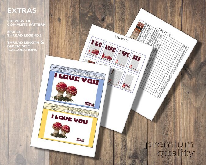 You get ready-made cross stitch patterns and calculations of thread lengths and fabric sizes for 12ct, 14ct, 16ct and 20ct:
