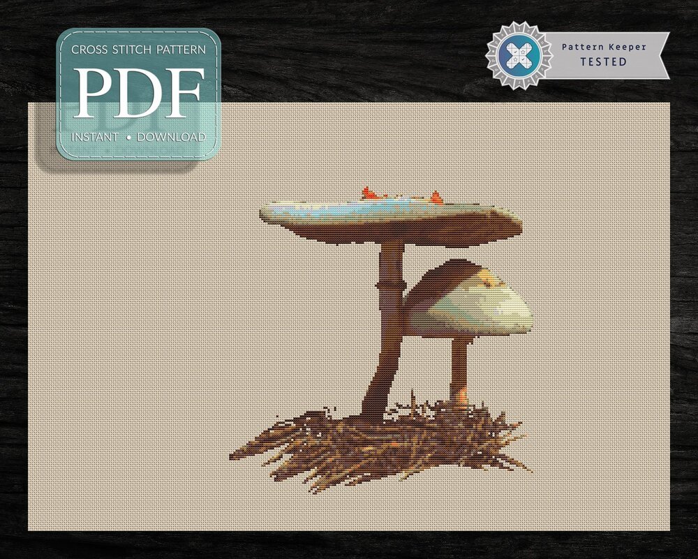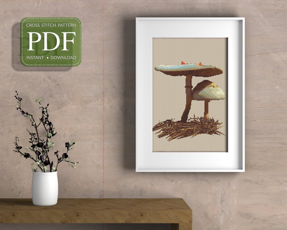 A cross stitch pattern with two of the most poisonous mushrooms that exist in the world: more dangerous than a crocodile, a snake and a lion at the same time.