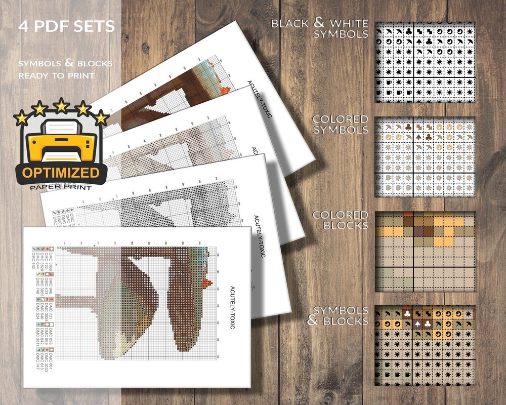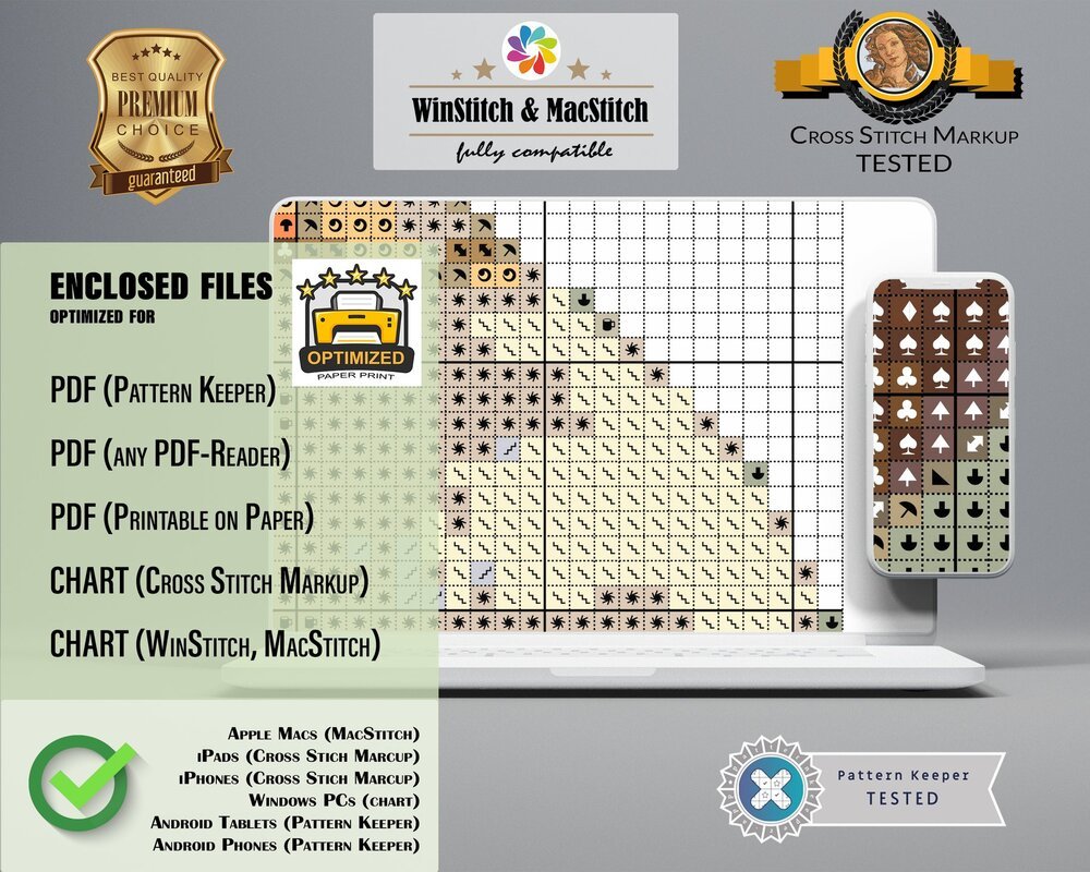 You will receive the cross stitch pattern as PDF files, available for instant download. The digital files are optimized for printing an paper or fore use on the screens of tablets, mobile phones or laptops (well tested for Pattern Keeper, WinStitch, etc.). You can buy these files right here and download them immediately.