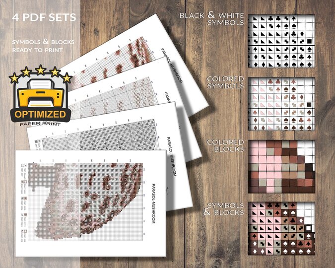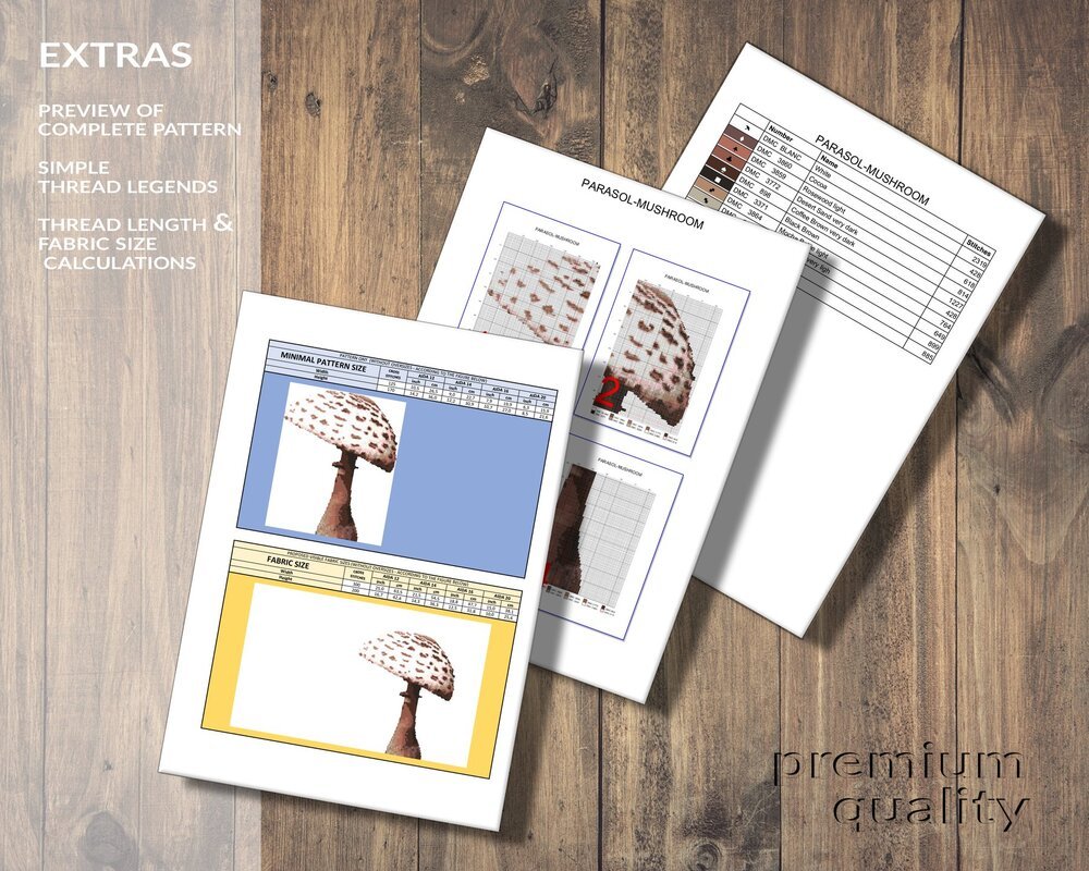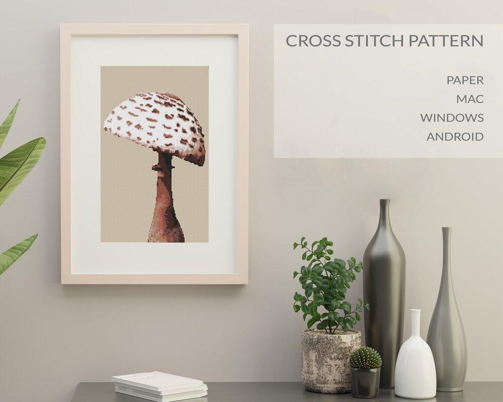 This cross stitch pattern features one of the most popular edible epices of all time: the parasol mushroom.