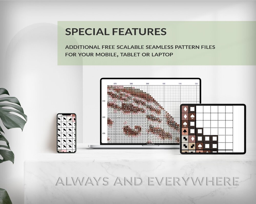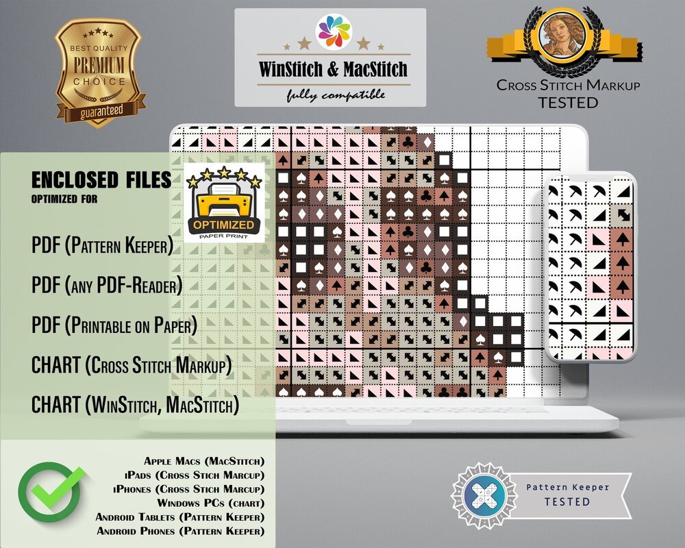 You will receive the cross stitch pattern as PDF files, available for instant download. The digital files are optimized for printing an paper or fore use on the screens of tablets, mobile phones or laptops (well tested for Pattern Keeper, WinStitch, etc.). You can buy these files right here and download them immediately.