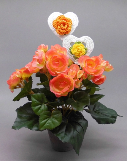 The different sizes of the hearts and flowers result from the use of different yarn and crochet hooks - crochet all hearts / flowers with the same pattern.