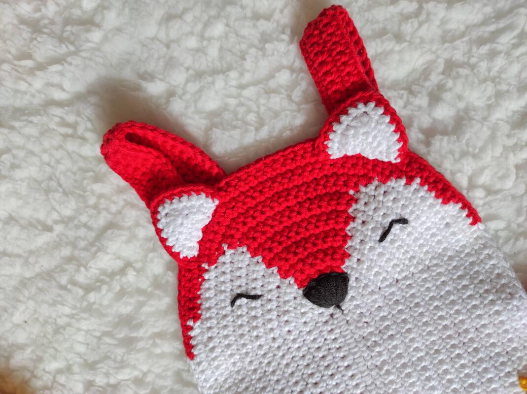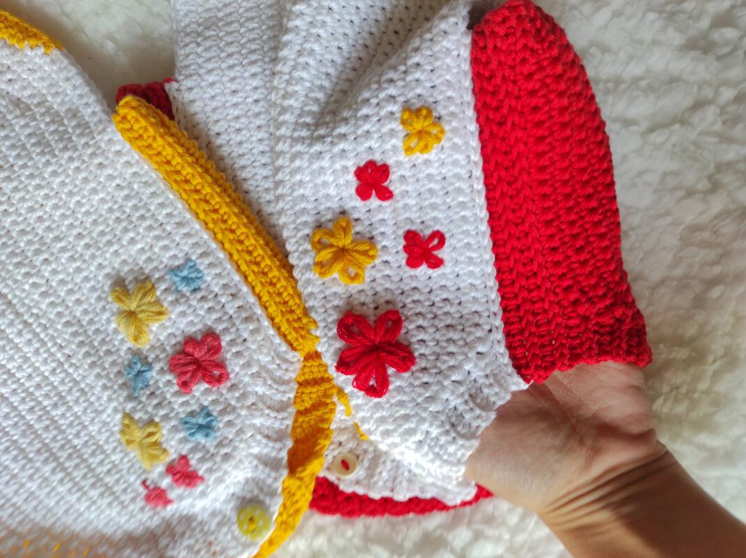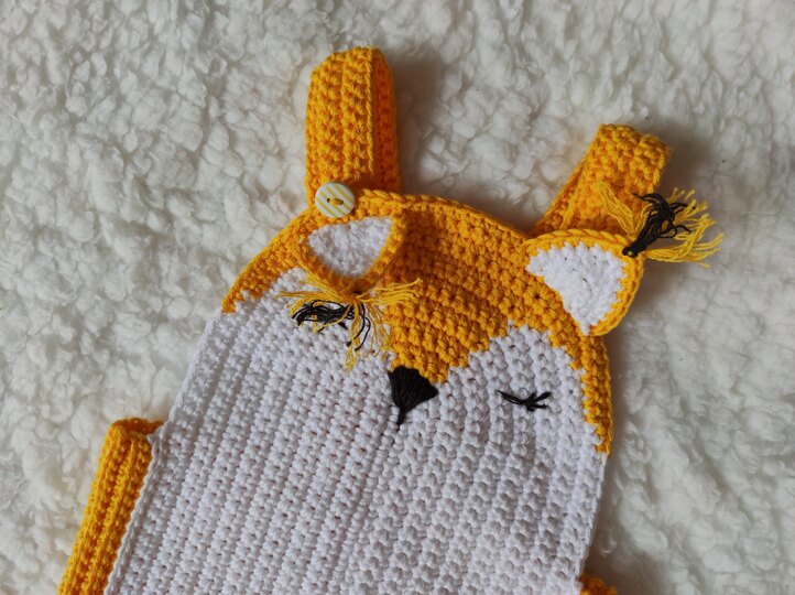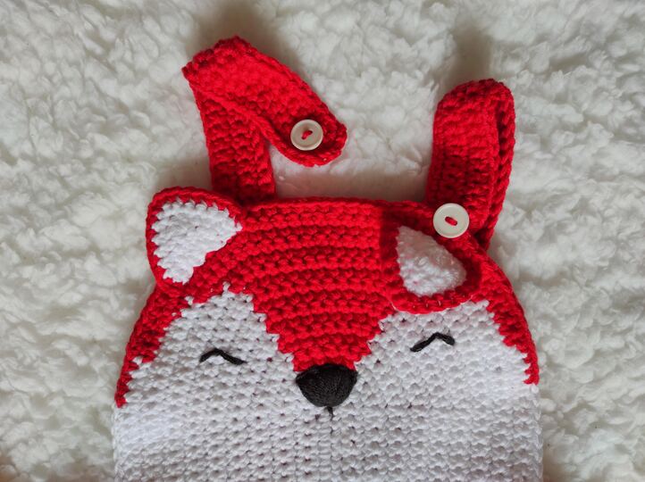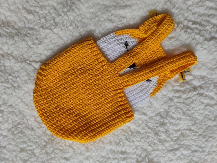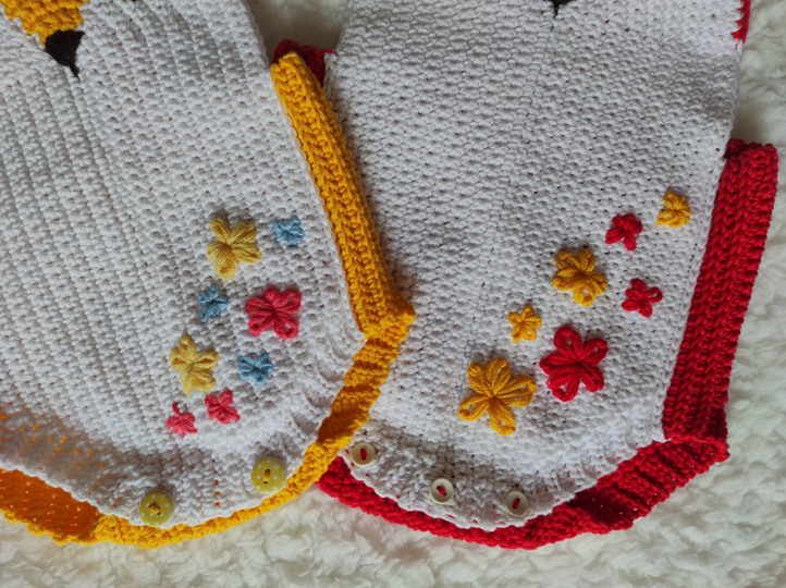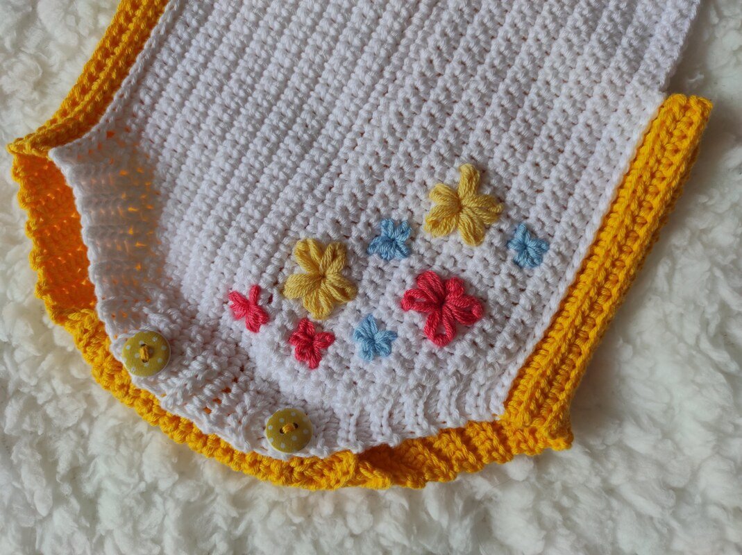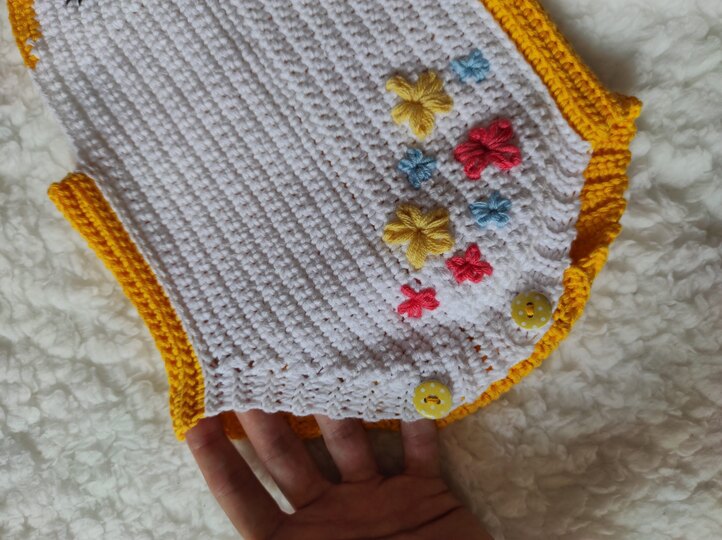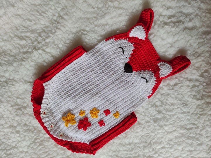 The romper is crocheted with one piece without seams. The buttons are hidden behind the ears.