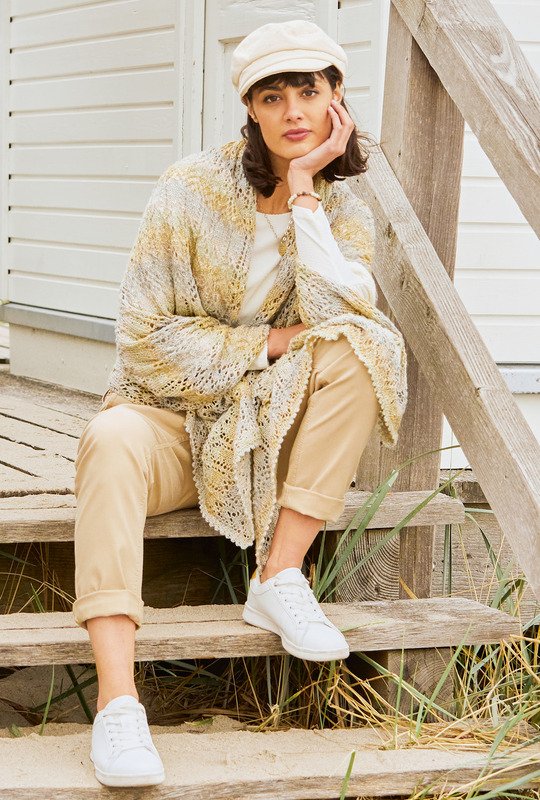 Farbverlaufsgarne haben sich inzwischen in der Handarbeits-Szene fest etabliert. Kein Wunder, denn es ist immer wieder spannend, wie sich während des Strickens die unterschiedlichen Nuancen entwickeln. Besonders schön kommen solche Garne auf so zarten, breiten Tüchern und Stolen zur Geltung, wie bei diesem Design der Fall ist. Die sanft geschwungenen Bögen des Ajourmusters unterstreichen den sanften Farbverlauf und muten wie feine Sandwellen an. Wie alle Lochmuster, erfordert auch dieses etwas Aufmerksamkeit, ist aber nicht ausgesprochen komplex und durch die übersichtliche Strickschrift unkompliziert nachzuarbeiten. Nach der Fertigstellung wird das feine Gespinst vorsichtig gespannt, damit sich die wahre Pracht des Lacemusters entfalten kann. Dann noch mit einer Runde feinen Picots umhäkeln.