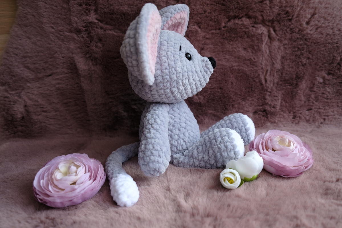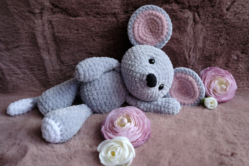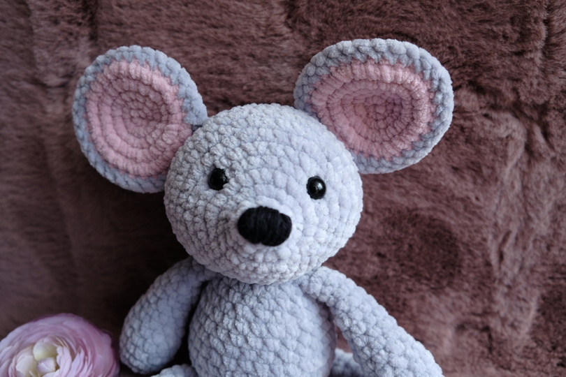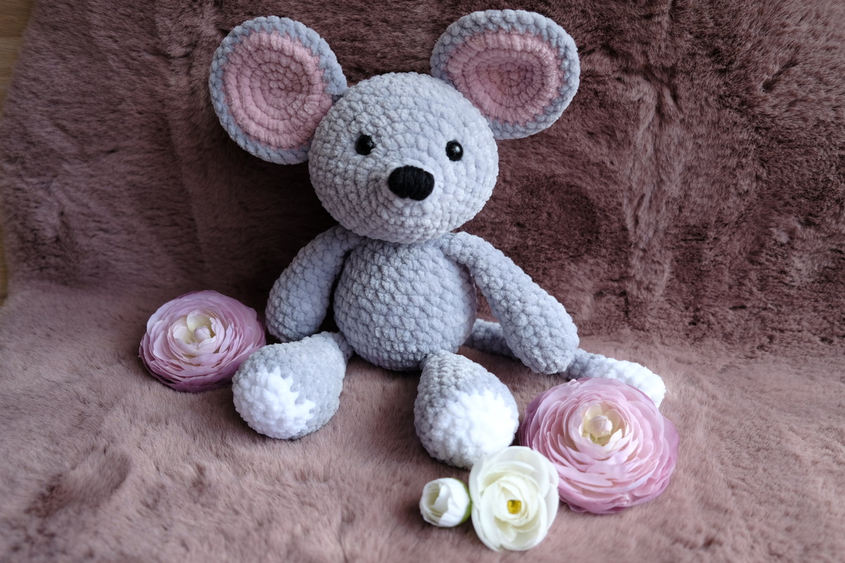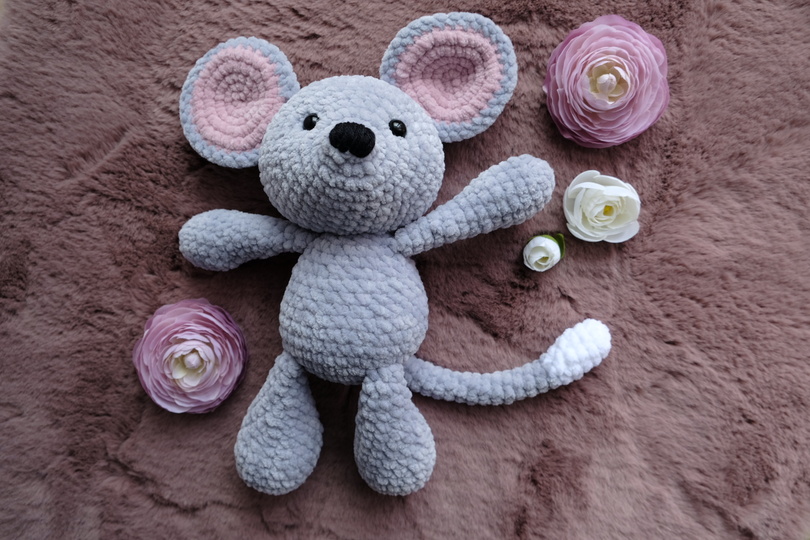 Die Anleitung ist für Chenillewolle und eine Häkelnadel 4,5 mm geschrieben, dann hat das Mäuschen eine Größe von ca. 25 cm. Natürlich kann auch jede andere Wolle verwendet werden – hier ändert sich die Größe entsprechend.