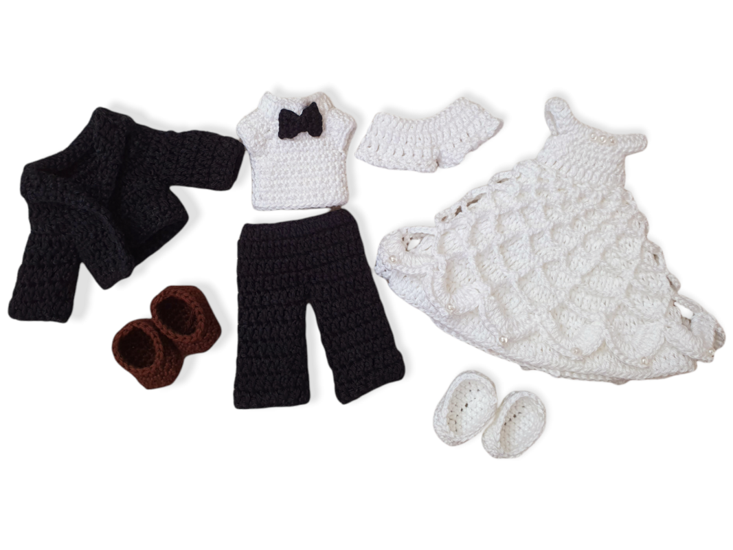 This guide includes the complete outfit for the bride and groom. The instructions for the dolls are not included.