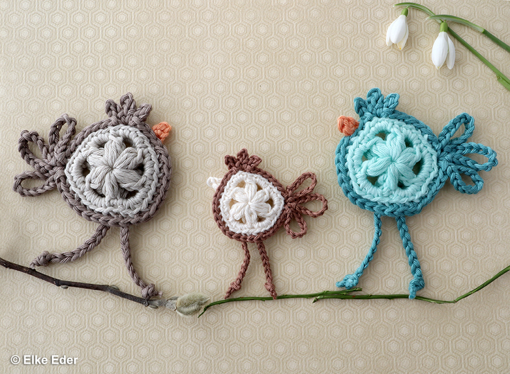 The legs consist of a continuous chain and are crocheted in - here you do not have to sew on or sew. Only the beak is fixed separately. Here, too, the two sizes result from the use of different yarn thicknesses.
