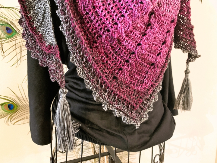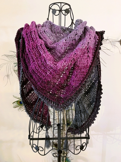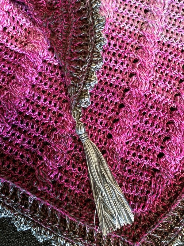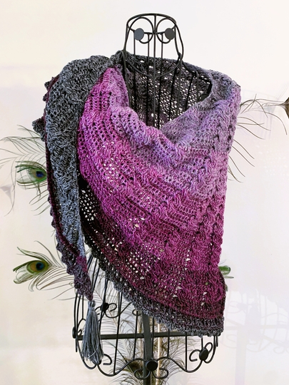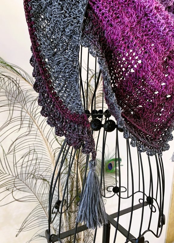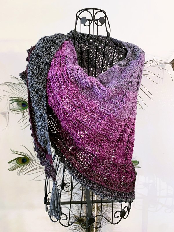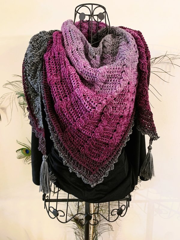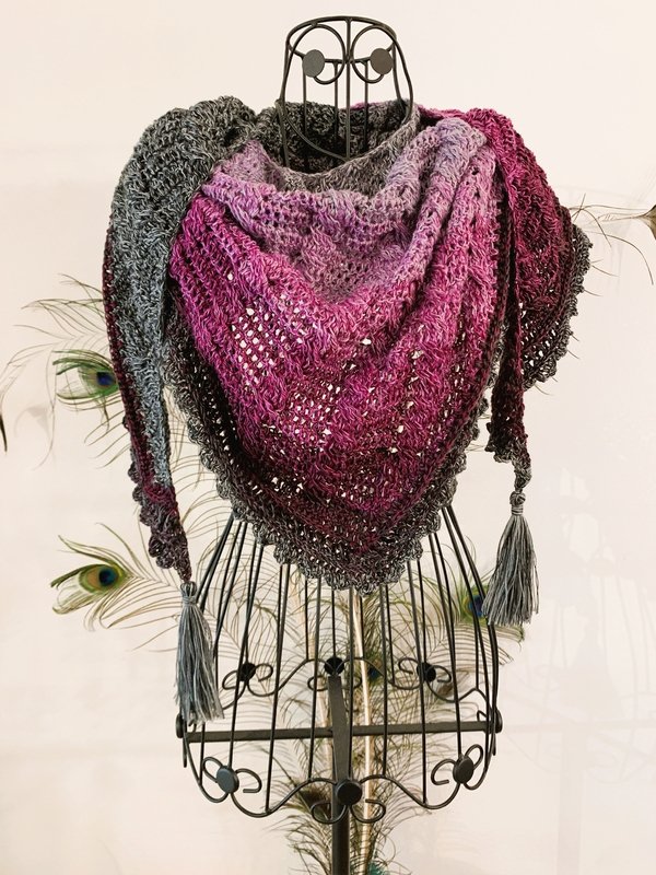 The triangular scarf "Dione" is crocheted asymmetrically, has a braid pattern and as an eye-catcher a scalloped edge and tassels.