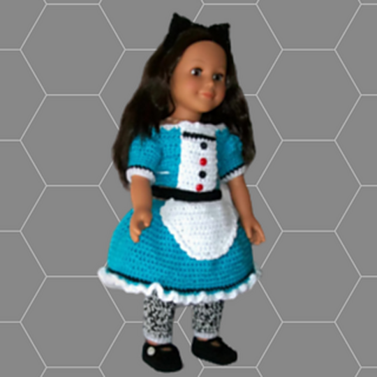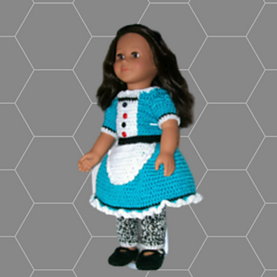 18” Doll pattern . Quick and easy to make this full ensemble. Pattern includes instructions for top , bottom skirt with pants attached, shoes, headband and belt. Makes a super cute outfit. Any little girl would love to add this little set to their collection.