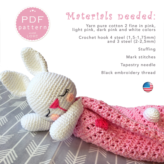 This pattern is simple and suitable for beginners. With this pattern you will make a cute Bunny comforter. It's very easy to follow and interesting. This toy will be a great gift for a baby from 3 months.