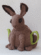 The main body of the cosy is knitted in a textured stitch to give the impression of the hare's fur. I love his big ears and they are positioned on his head to look alert as if he is listen out for something.
